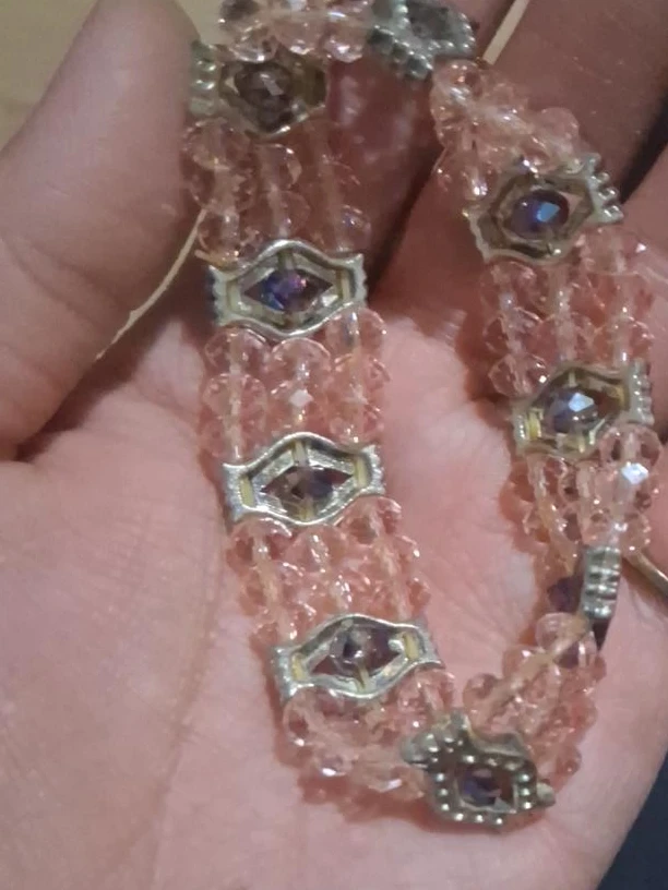 This is a cute pink beaded bracelet! It features a triple-strand design with clear pink beads and silver-tone accents. The bracelet has a stretchable band for a comfortable fit.