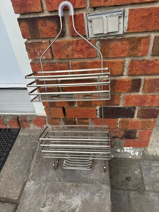 Keep your shower essentials organized with this convenient hanging shower caddy, featuring two shelves and hooks for washcloths or razors, in used condition. This sturdy caddy is designed to hang over the showerhead for easy installation and accessibility. * Two-tier design for ample storage * Built-in hooks for additional hanging options * Durable, rust-resistant finish Declutter your shower space with this practical organizer! If the ad is up, it's still available!