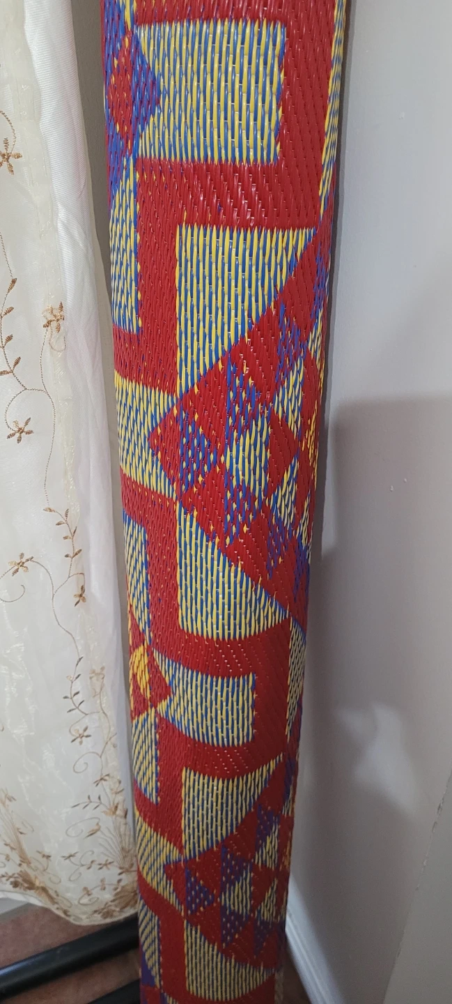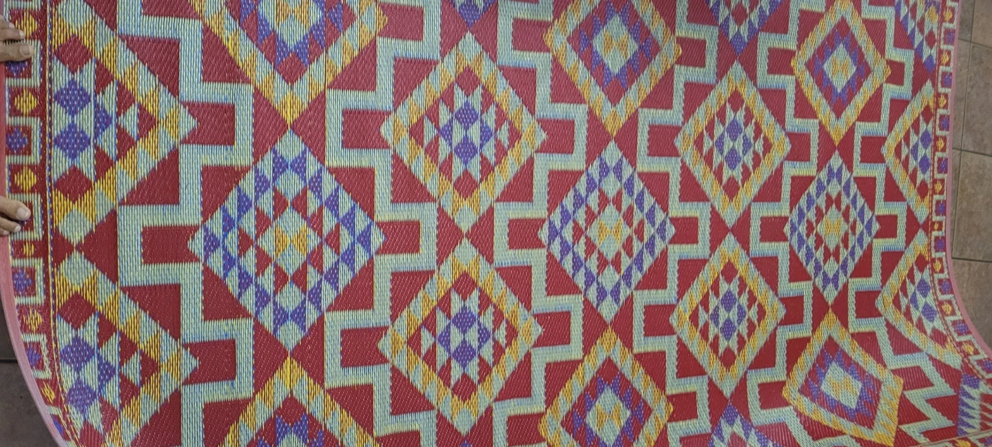 Here's a colourful mat, perfect for adding a vibrant touch to any room! It features a geometric pattern with red, yellow, and blue hues