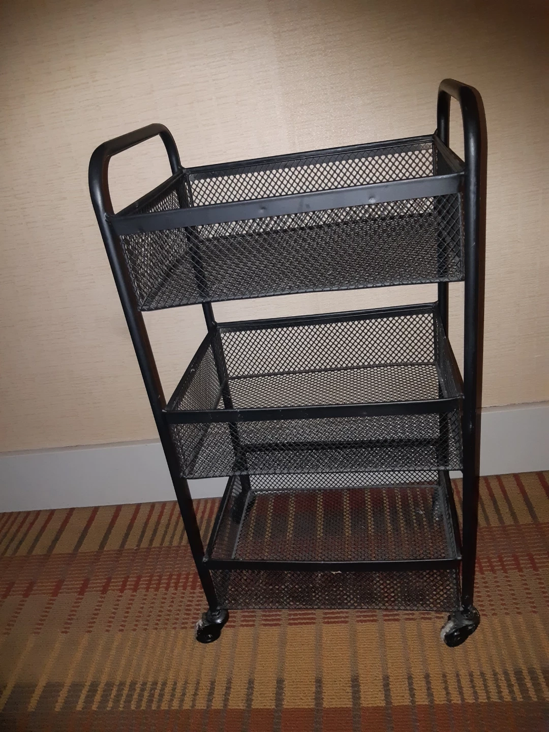 This black metal rolling cart is perfect for extra storage in any room. It has a sturdy metal frame and mesh baskets. Great for organizing your space!