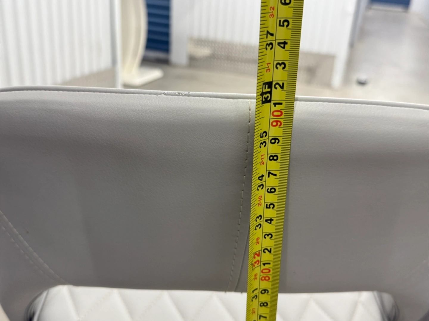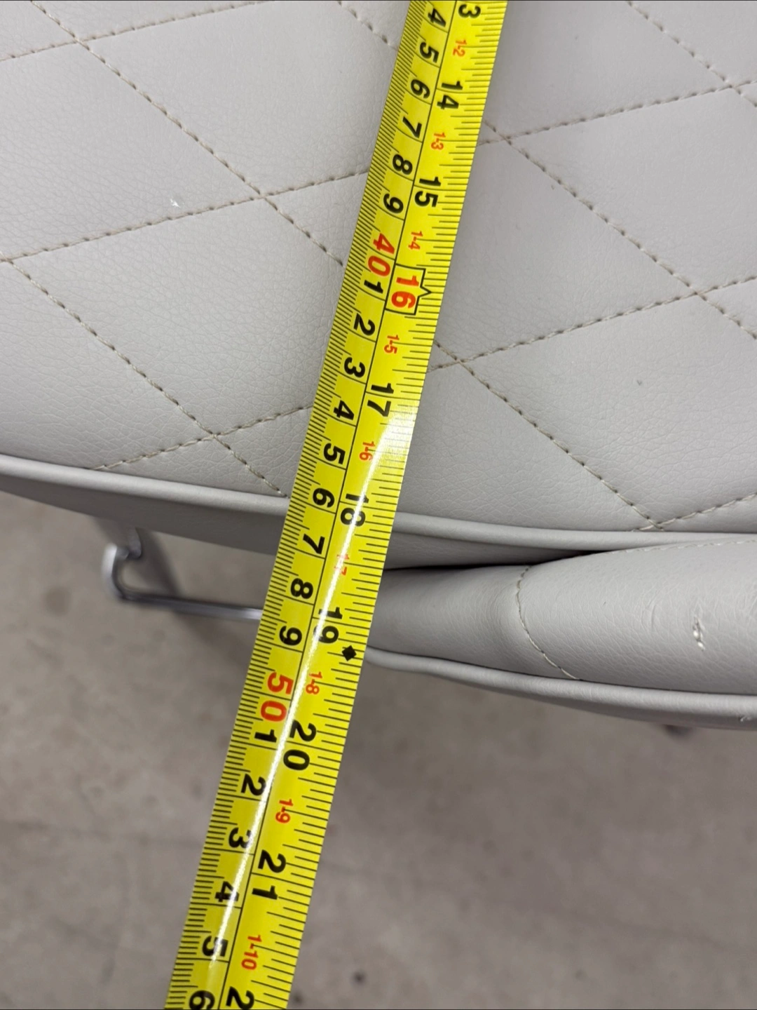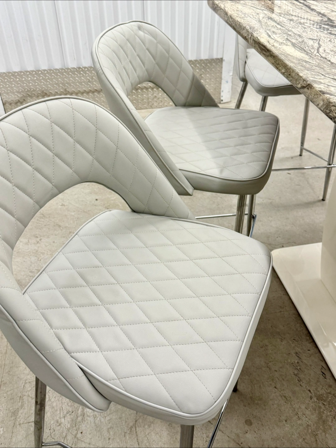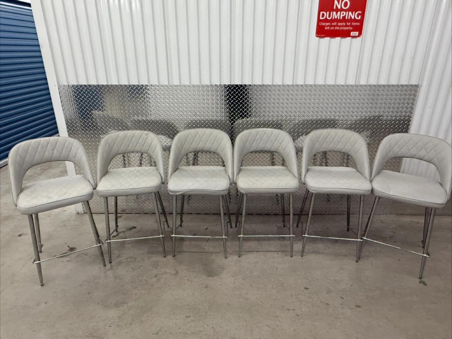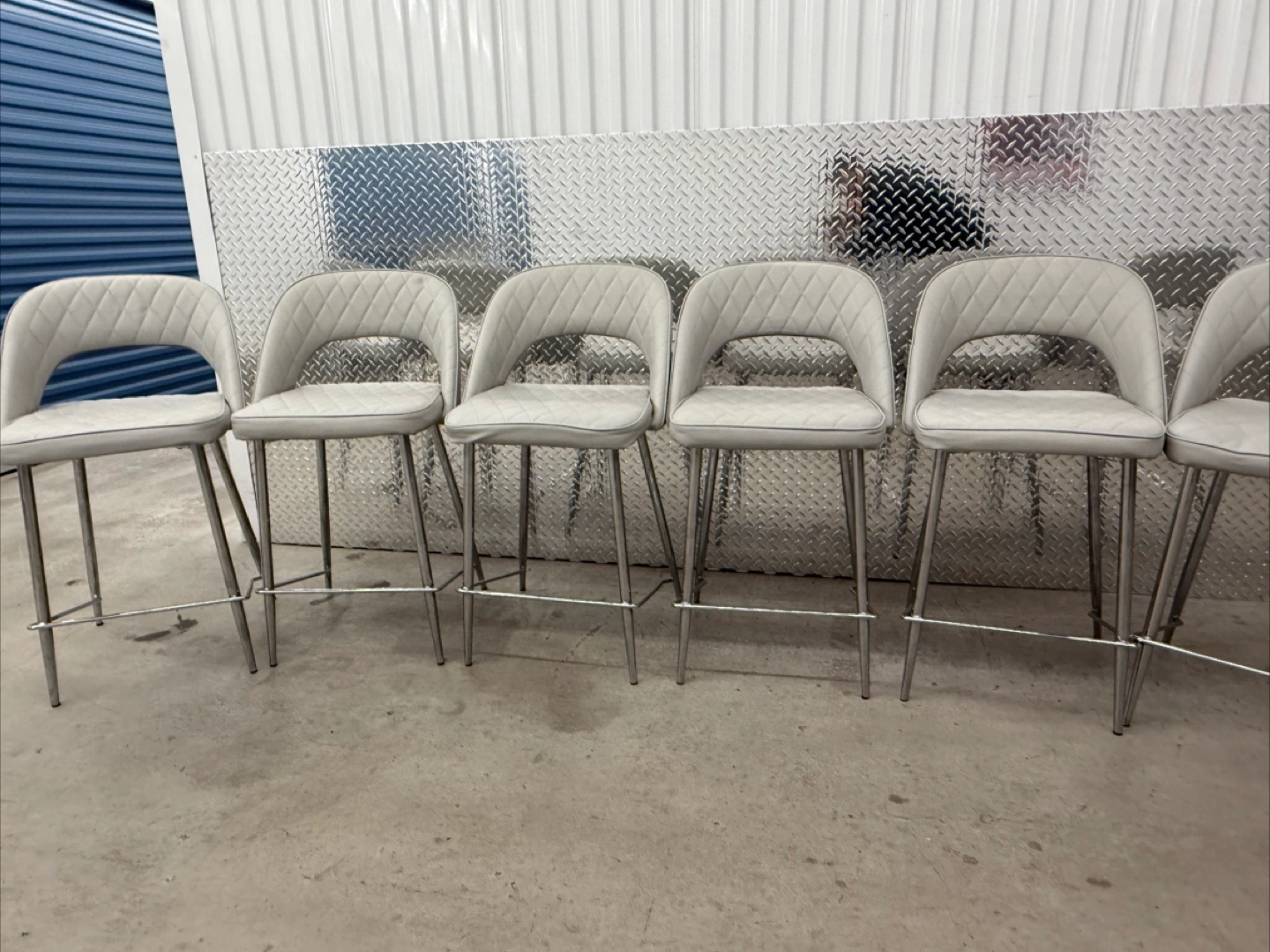 Selling a set of six bar stools. They're light grey with a quilted pattern on the seat and back. The legs are silver. Great for a kitchen island or bar area!