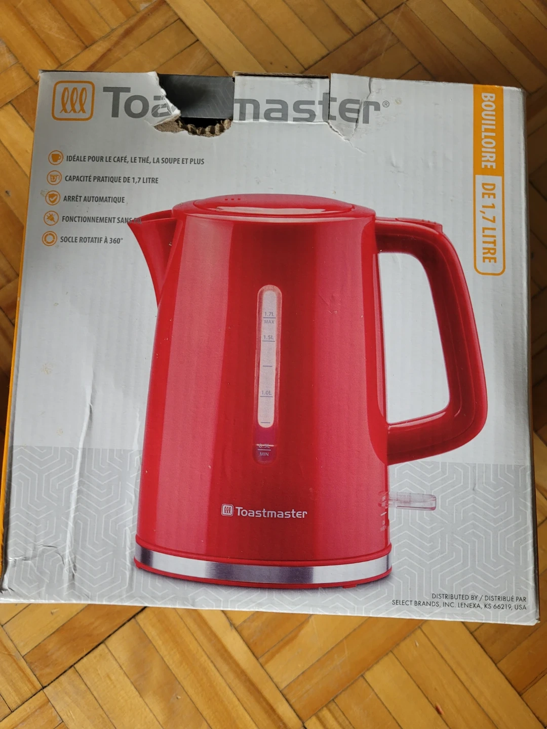 Selling a Toastmaster red kettle $20, perfect for your tea or coffee! Also included is a Munchkin microwave sterilizer $25, great for sterilizing baby bottles quickly and easily, waterfilter $25. Both items are brand new in boxes, and ready for a new home!