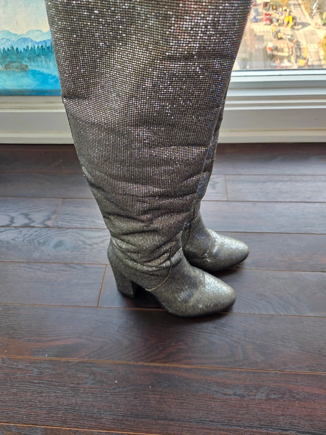 Selling a pair of size 7 sparkly silver knee-high boots! They have a block heel and a zipper on the side. Perfect for adding a bit of glam to any outfit