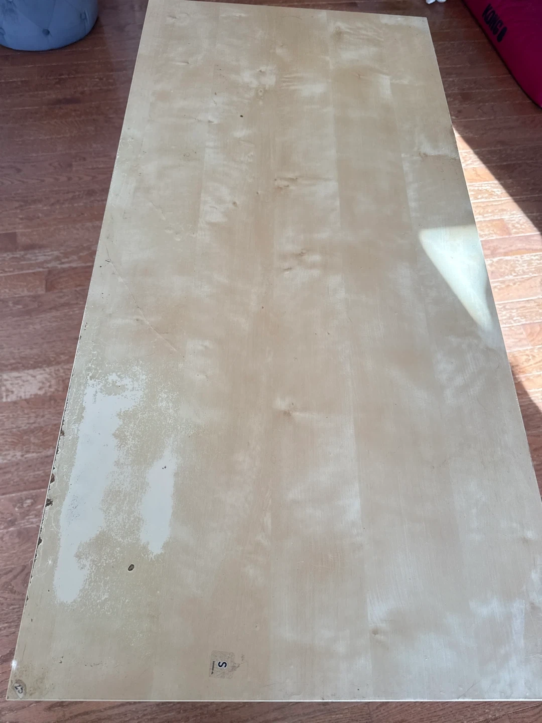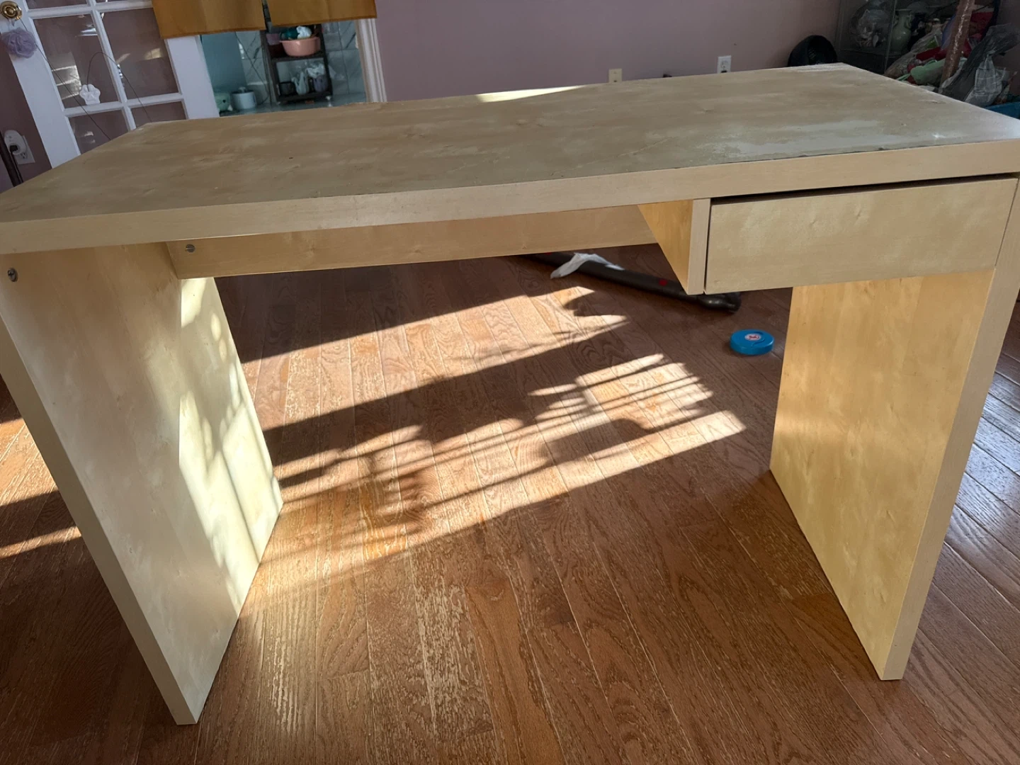 Selling a wooden desk with a single drawer. It has a light wood finish and a minimalist design. There are some signs of wear on the top surface, as shown in the pictures. It's sturdy and would be great for a home office or study space. Please note there is some wear and tear.may need a new cover tape if needed