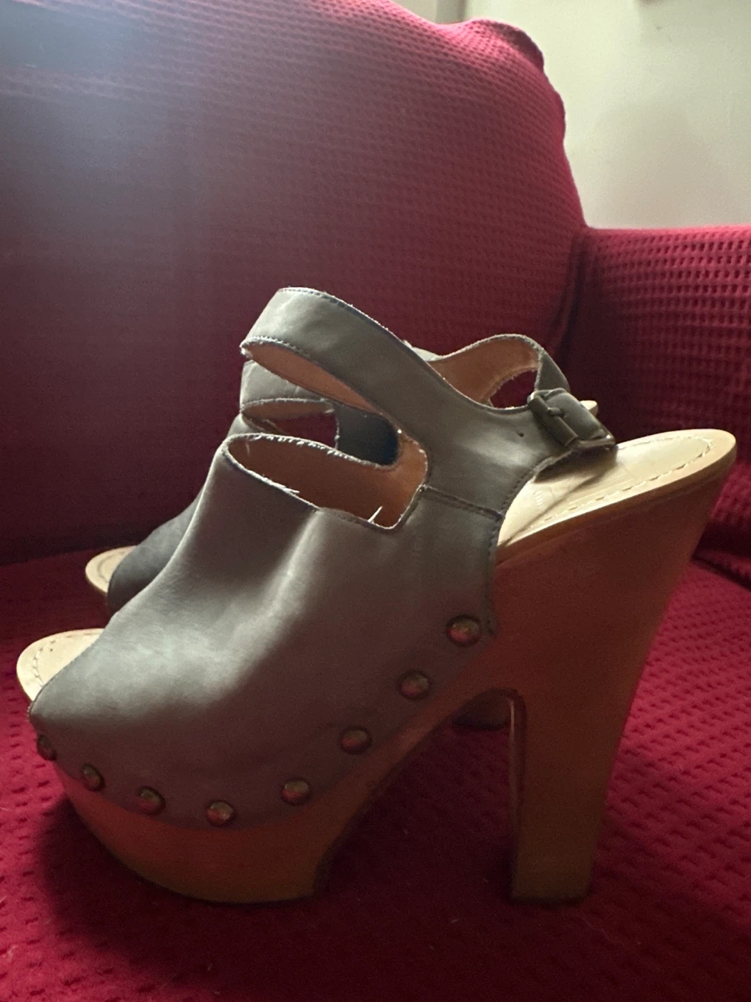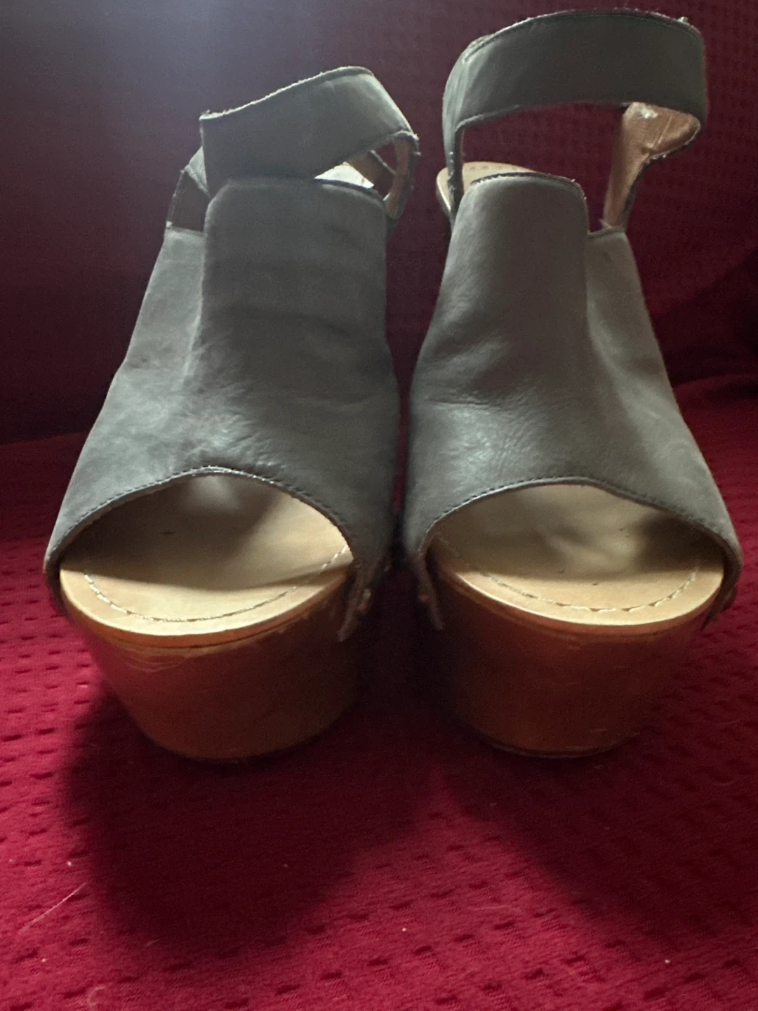 They feature a gray leather upper and a wooden platform heel. The sandals have an open-toe design with an adjustable ankle strap. They are in good condition and ready for a new home!