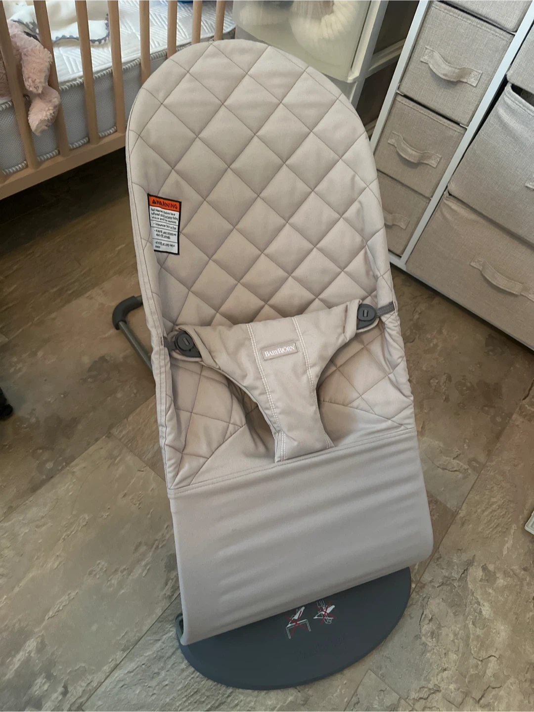 Selling a BabyBjörn Bouncer Balance Soft in beige! It's in great (like new) condition and ready for a new home. This bouncer is lightweight and provides natural rocking, making it perfect for soothing your little one. It's also easy to fold and transport, so you can bring it anywhere you go!