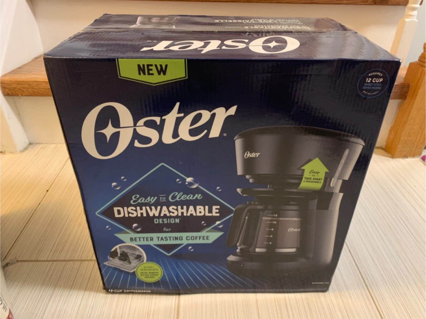 I'm selling a brand new Oster 12-cup coffee maker! It features an easy-to-clean, dishwasher-safe design for better-tasting coffee. It's easy to take apart and reassemble. Requires 12-cup basket-style coffee filters.