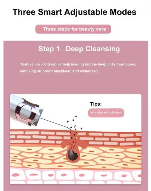 1. Cleansing: Positive ions + Ultrasonic help dislodge blackheads, whiteheads, and deep dirt from your pores. (Use with cleanser)