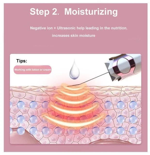 2. Moisturizing: Negative ions + Ultrasonic push your serums and creams deeper for maximum absorption and hydration. (Use with lotion or cream)