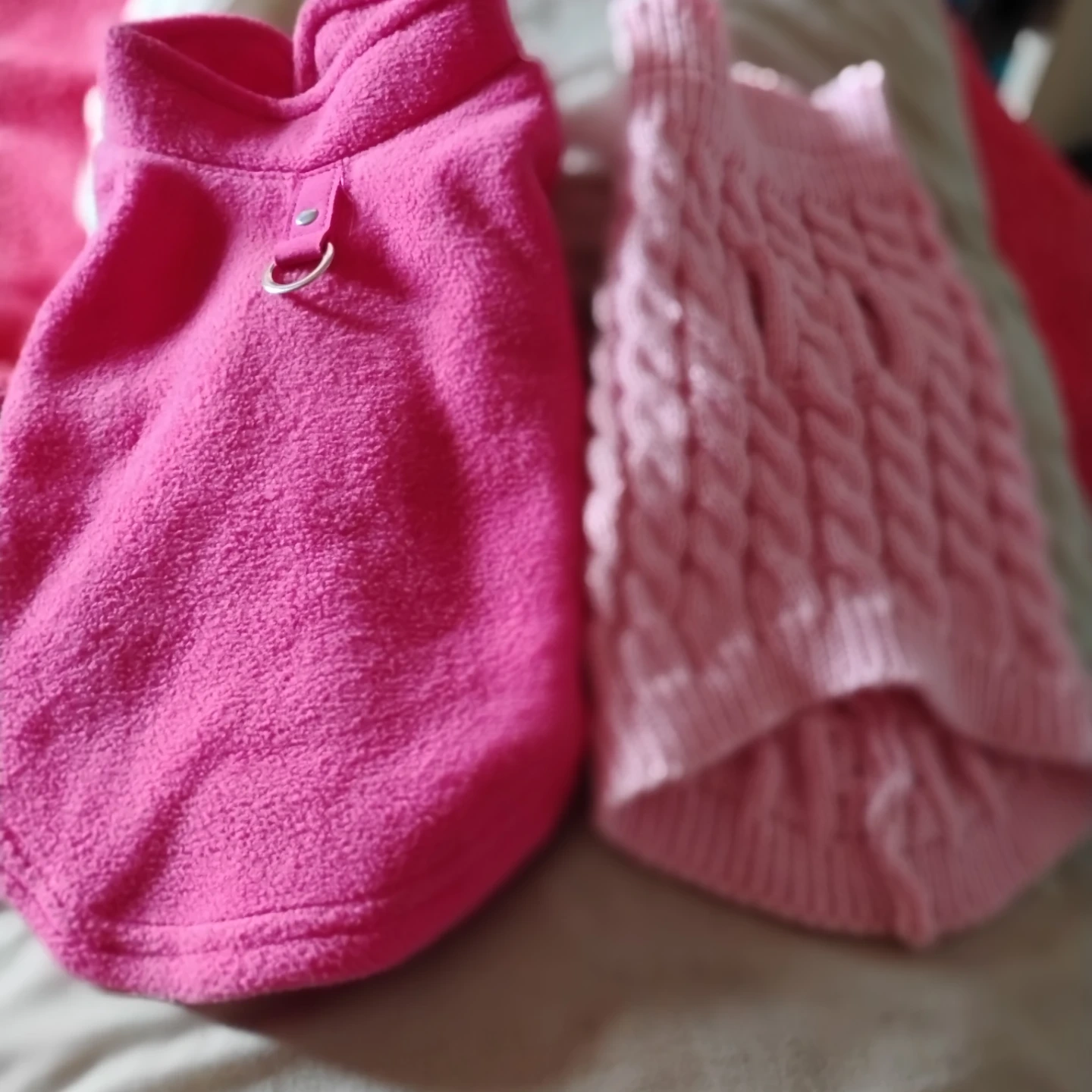 Two cute pink dog sweaters! One is a cozy fleece and the other is a stylish knit. Both are in great condition and perfect for keeping your furry friend warm on chilly days. Size small