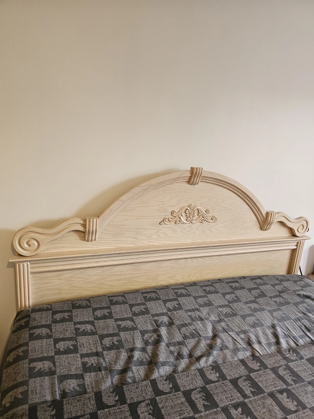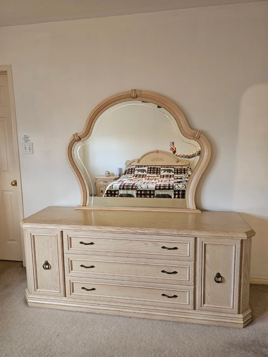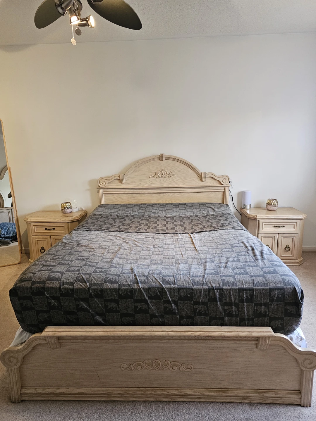 Selling a complete wooden bedroom set! Gently used, It includes a bed frame, a dresser with a mirror, and two nightstands. All pieces are in good condition and ready to find a new home. The set has a classic design that would fit well in many different room styles. Selling it for moving