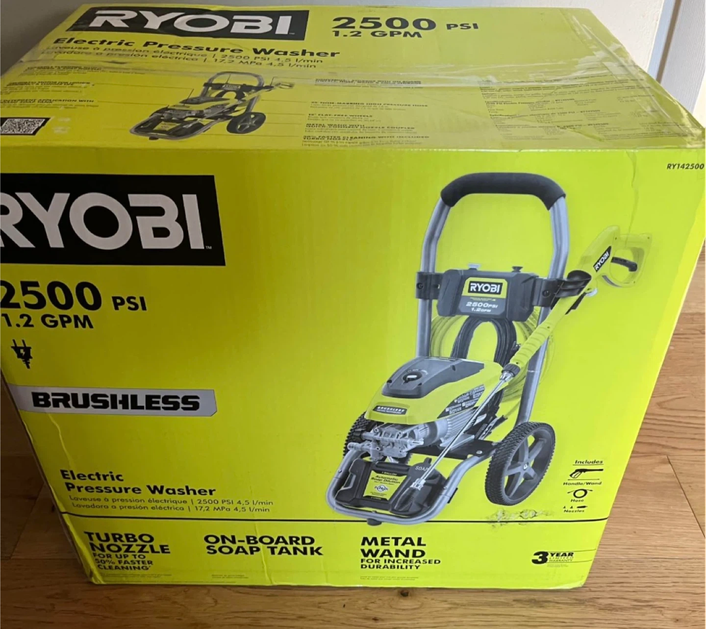 Selling a brand new Ryobi 2500 PSI electric pressure washer! It's still in its original box and includes the handle/wand and nozzles. This model features a brushless motor and delivers 1.2 GPM. Also has a turbo nozzle for up to 50% faster cleaning and an on-board soap tank for added convenience!