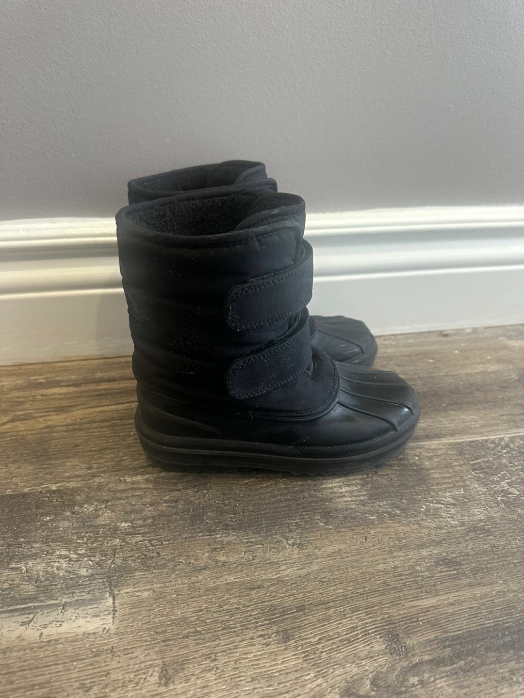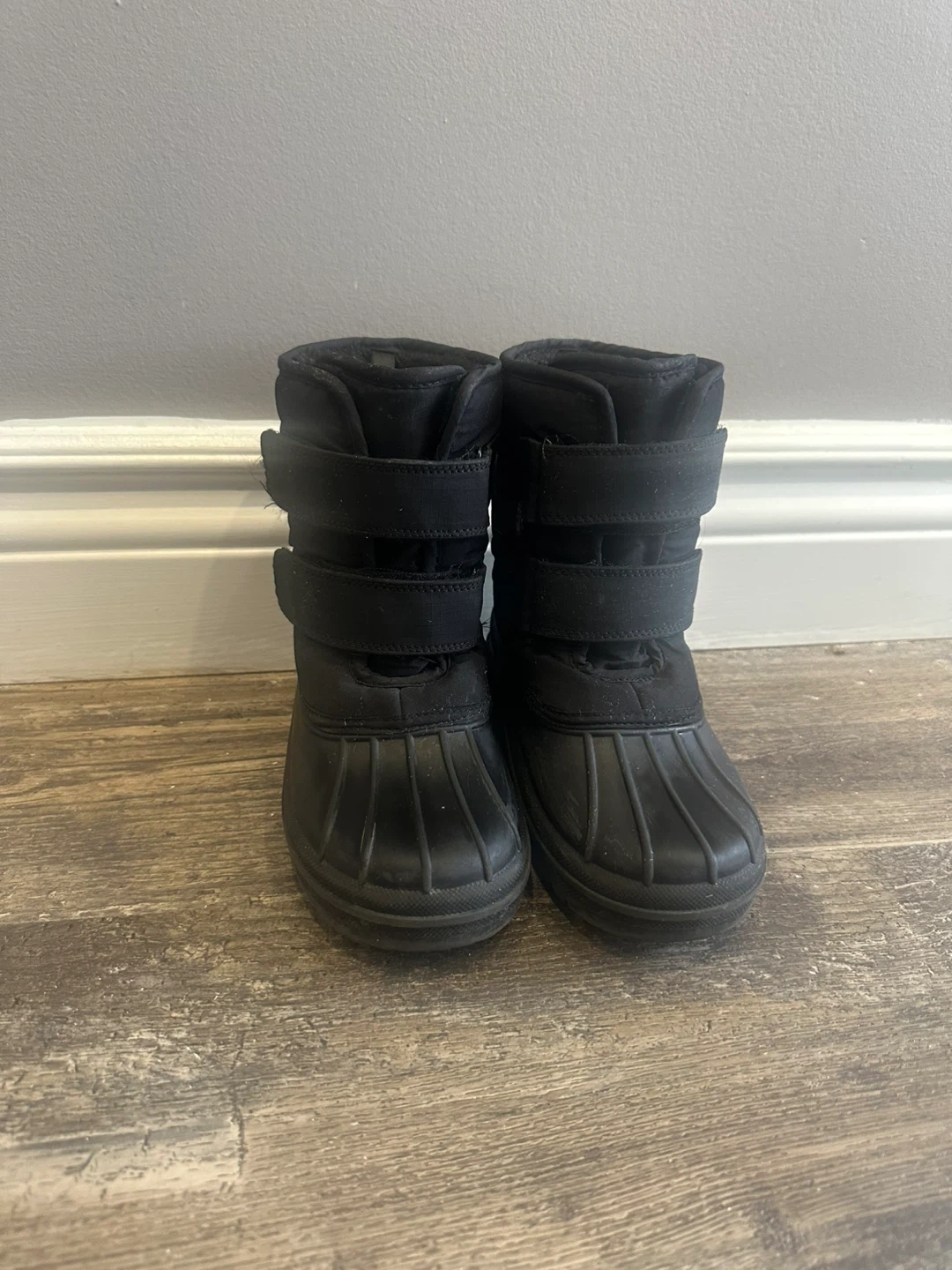 These black winter snow boots are in great condition and ready for the snow! They feature a sturdy construction and velcro straps for easy on and off. Perfect for keeping little feet warm and dry during the winter months