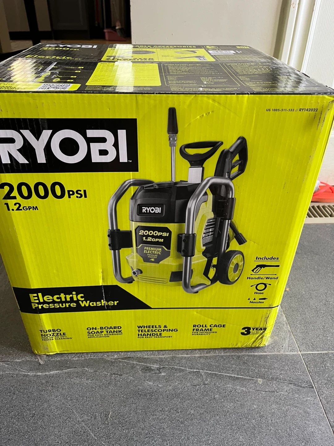 I'm selling a brand new Ryobi 2000 PSI electric pressure washer, still in the box! It features a turbo nozzle for up to 50% faster cleaning and an on-board soap tank for easy detergent application