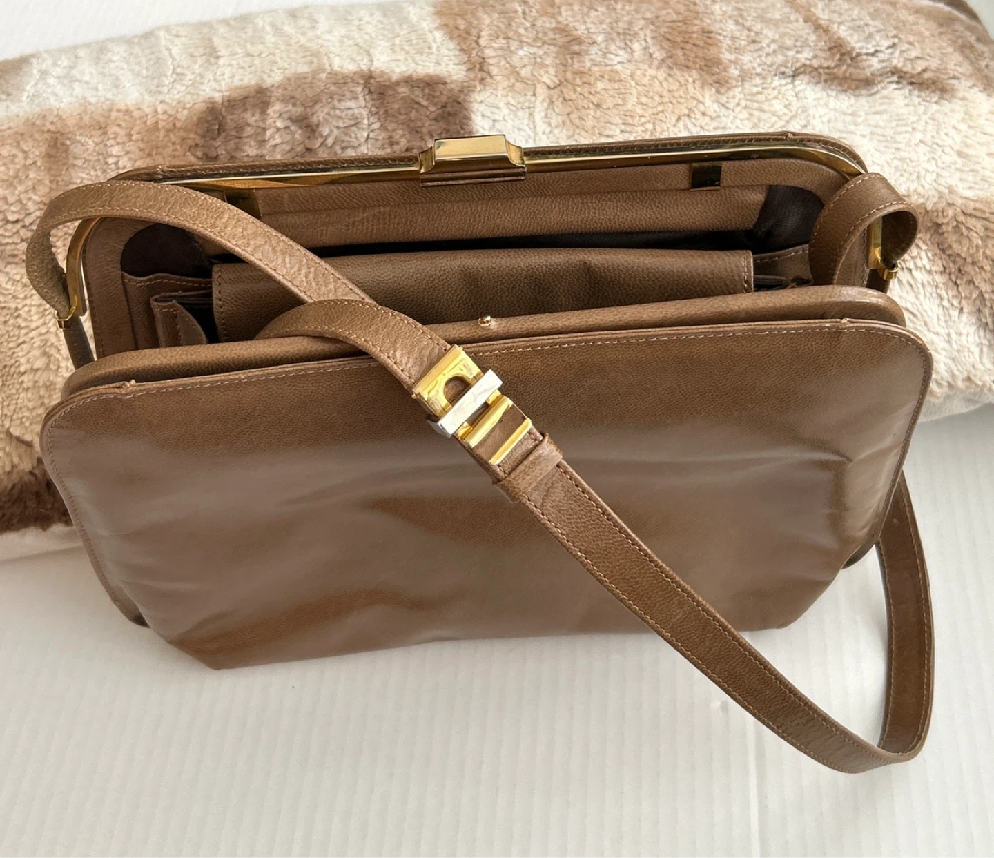 Selling a vintage leather handbag in a lovely brown colour. It has a unique clasp closure and an adjustable shoulder strap. The interior has a few compartments, including a zippered one. It's a stylish and classic piece! This piece is in great clean condition. It’s well made with good quality materials.