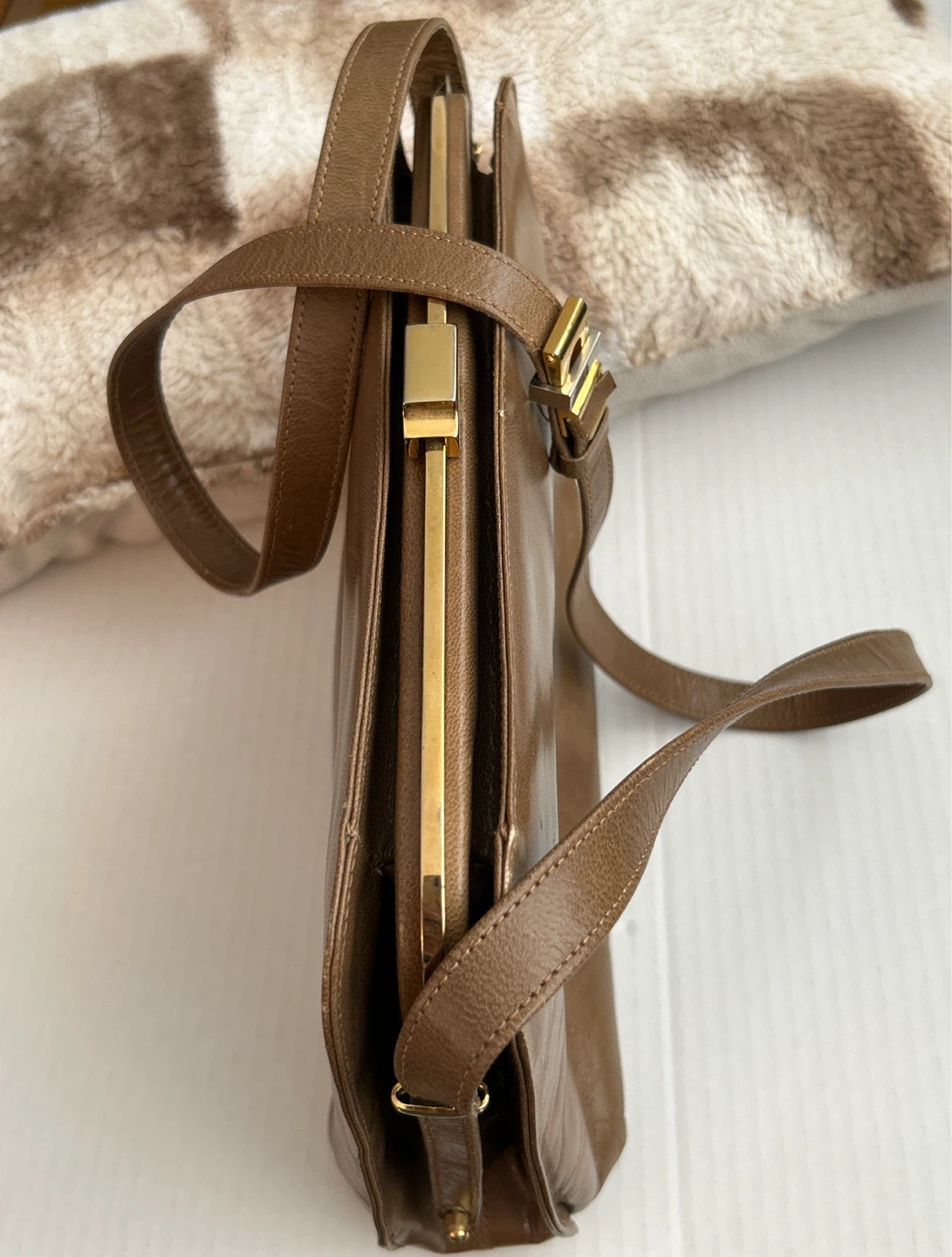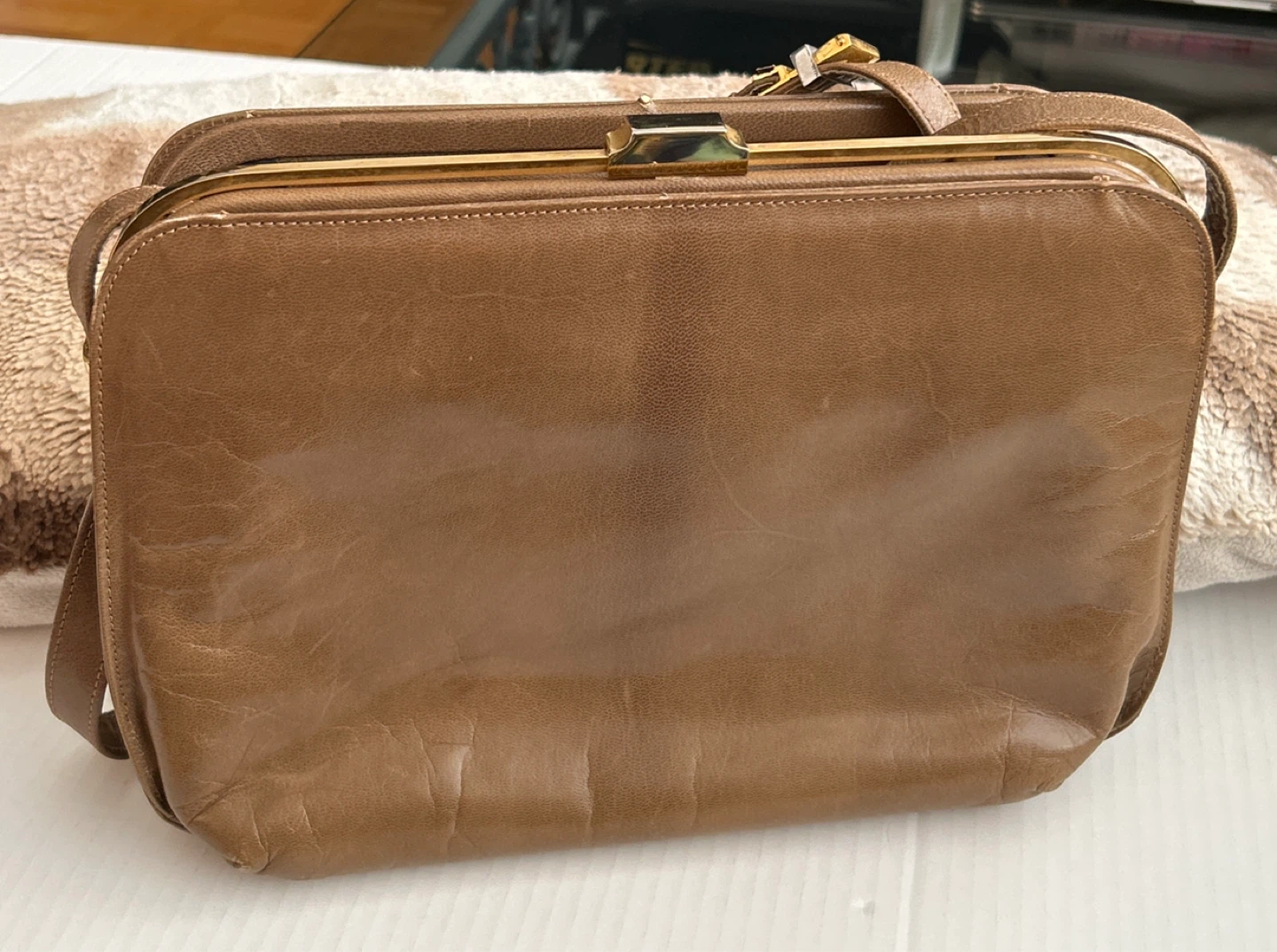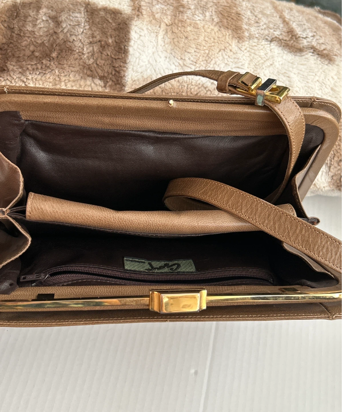 Selling a vintage leather handbag in a lovely brown colour. It has a unique clasp closure and an adjustable shoulder strap. The interior has a few compartments, including a zippered one. It's a stylish and classic piece! This piece is in great clean condition. It’s well made with good quality materials.