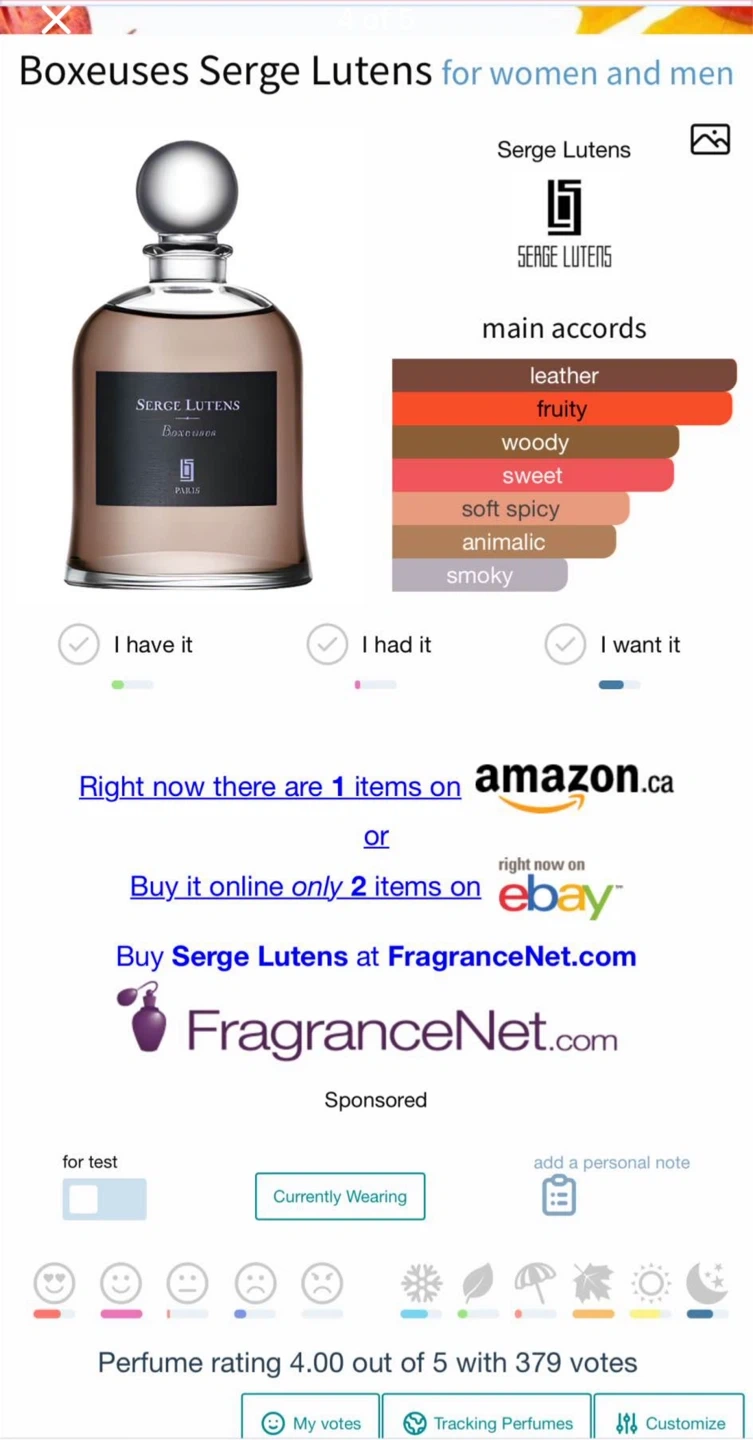 Buy & SellDiscontinued Serge Lutens Boxeuses 75mlDiscontinued Serge Lutens Boxeuses 75ml$300Brand new in box. Meetup in Caledon or I can deliver/ship for a fee.WHERE TO MEETCheck LocationView MapSELLERverifiedJessicaMayfield West14810 reviews0 chats·0 favorites·5 views