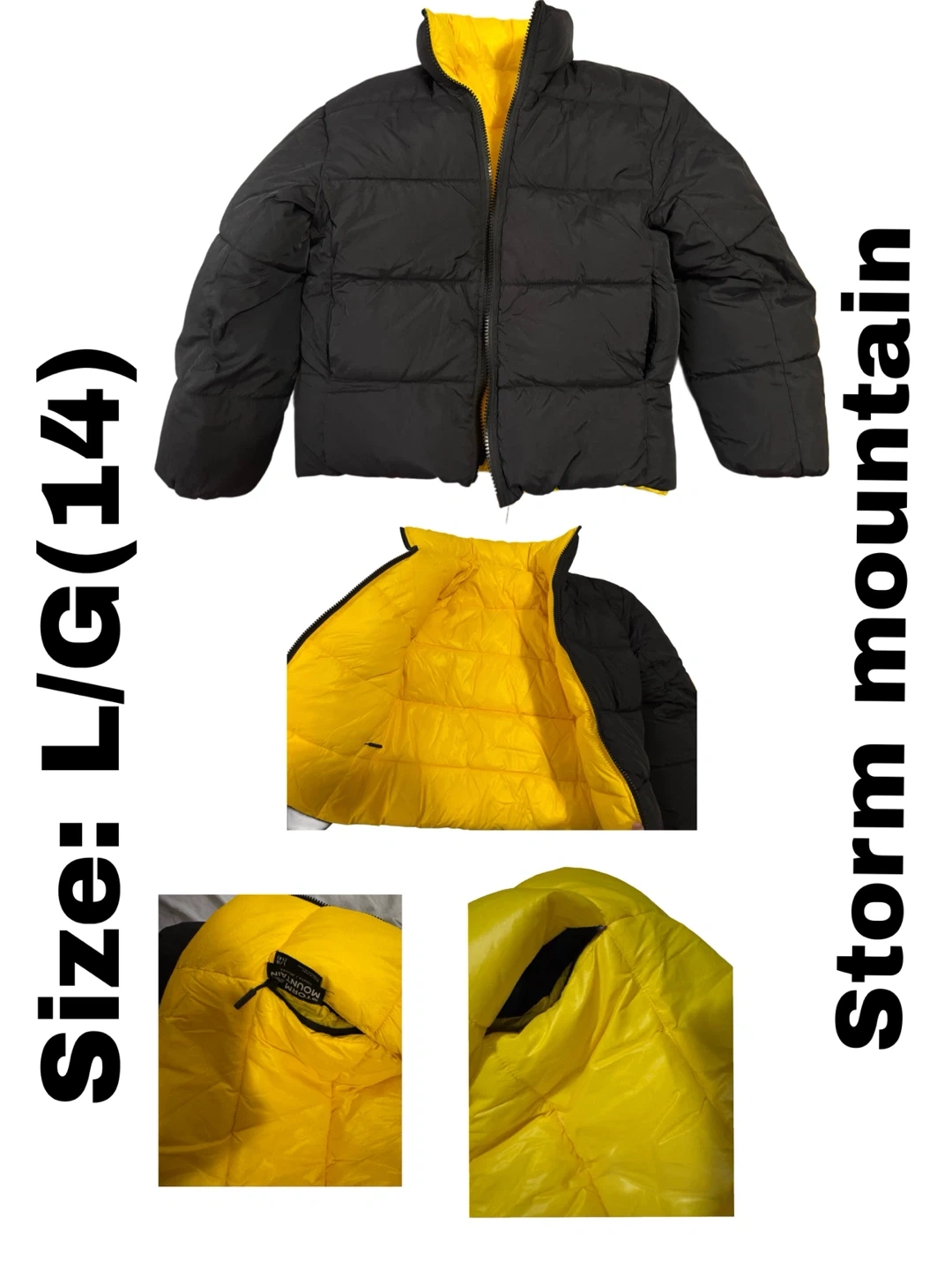 107Cozy Storm Mountain puffer jacket in size L/G (14). It's black on the outside with a bright yellow lining. Perfect for staying warm on chilly days!