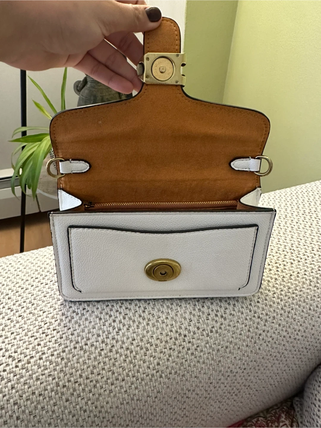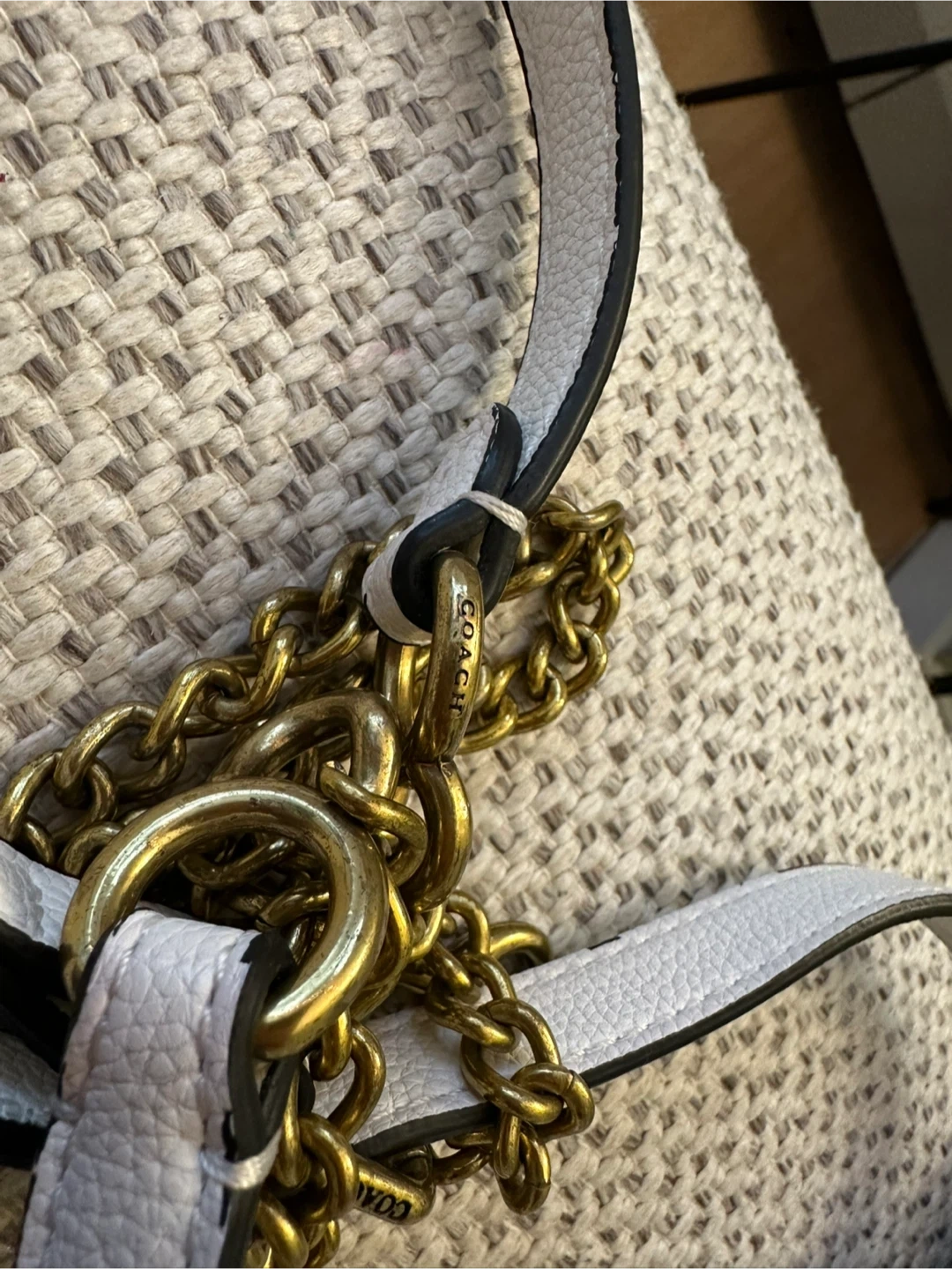 Selling a Coach Tabby 20 shoulder bag in white. It's in great condition and perfect for everyday use! The bag features a gold-tone 'C' buckle and a detachable chain strap.