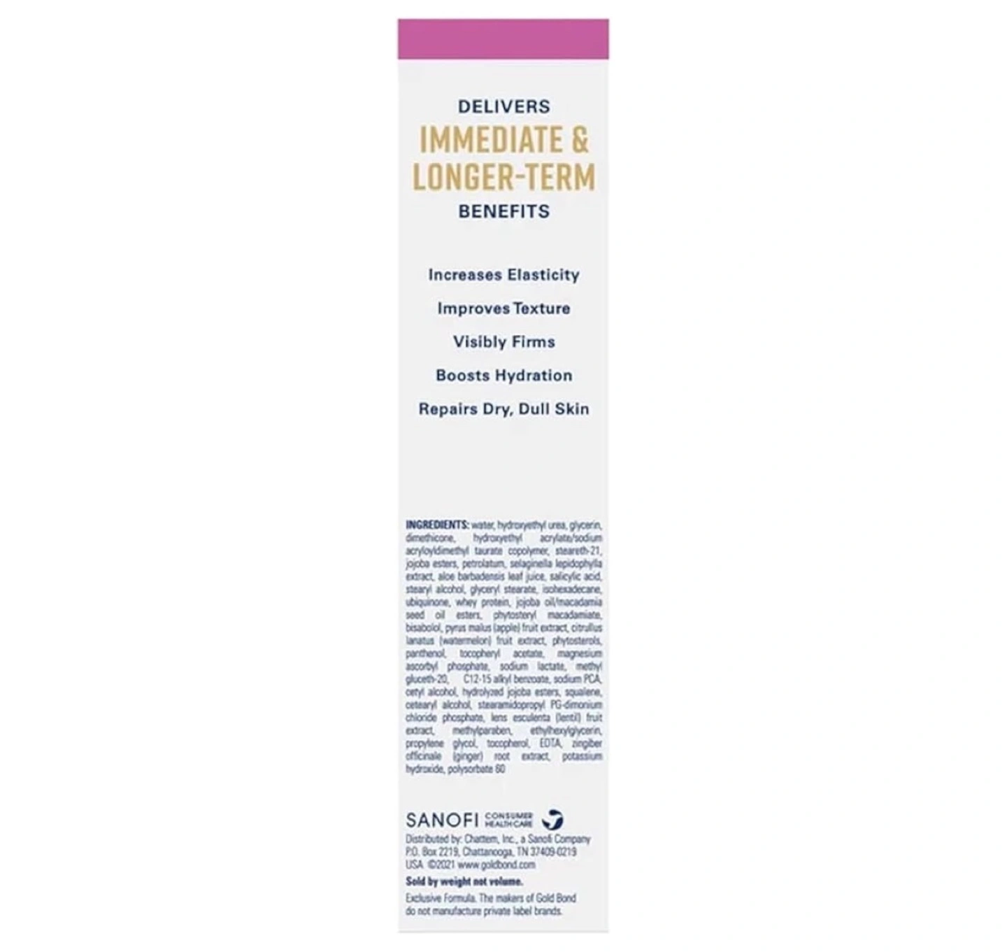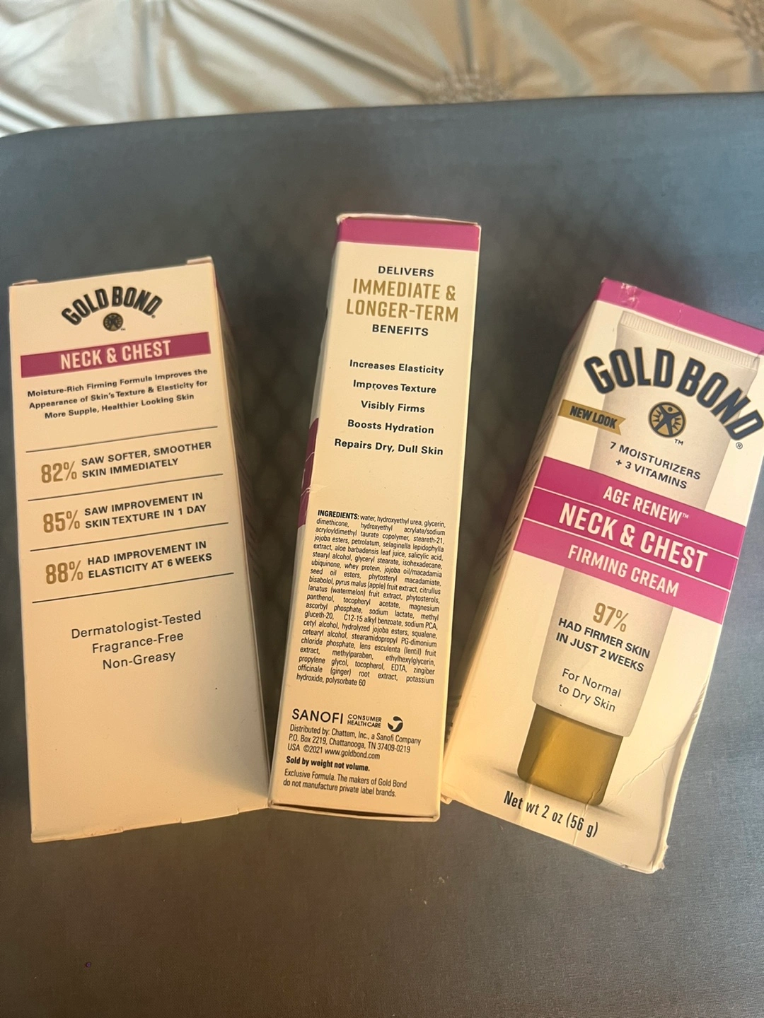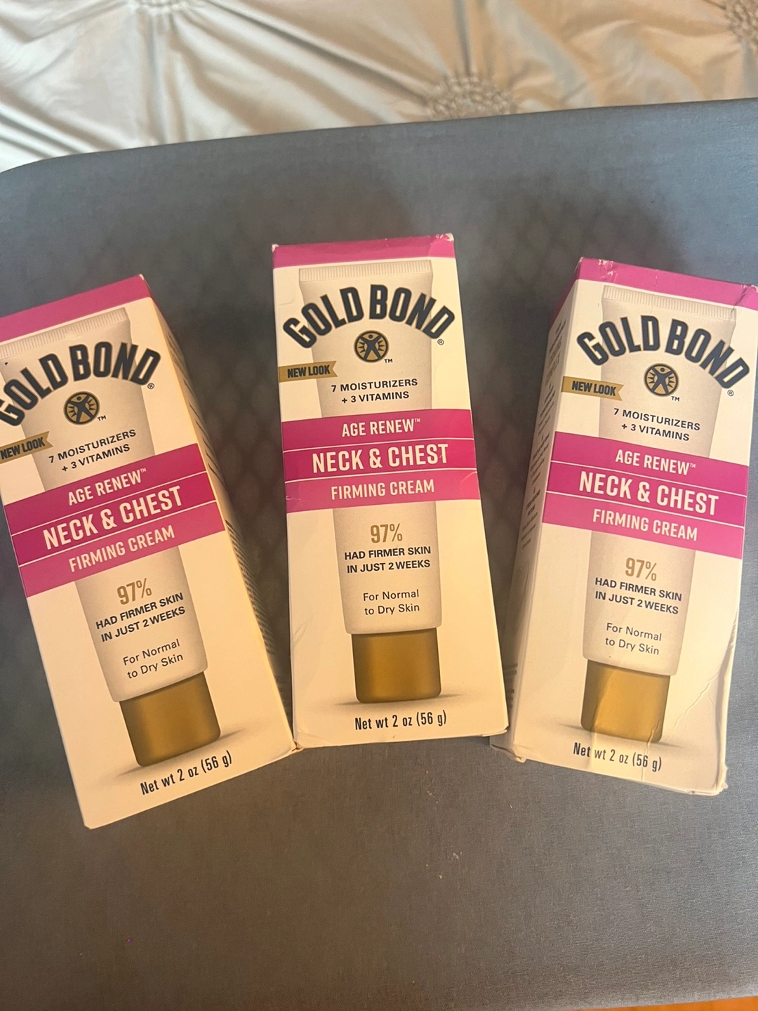 I'm selling a Gold Bond Age Renew Neck & Chest Firming Cream. It contains 7 moisturizers and 3 vitamins. It helps to gently exfoliate to reveal younger-looking complexion. The net weight is 2 oz