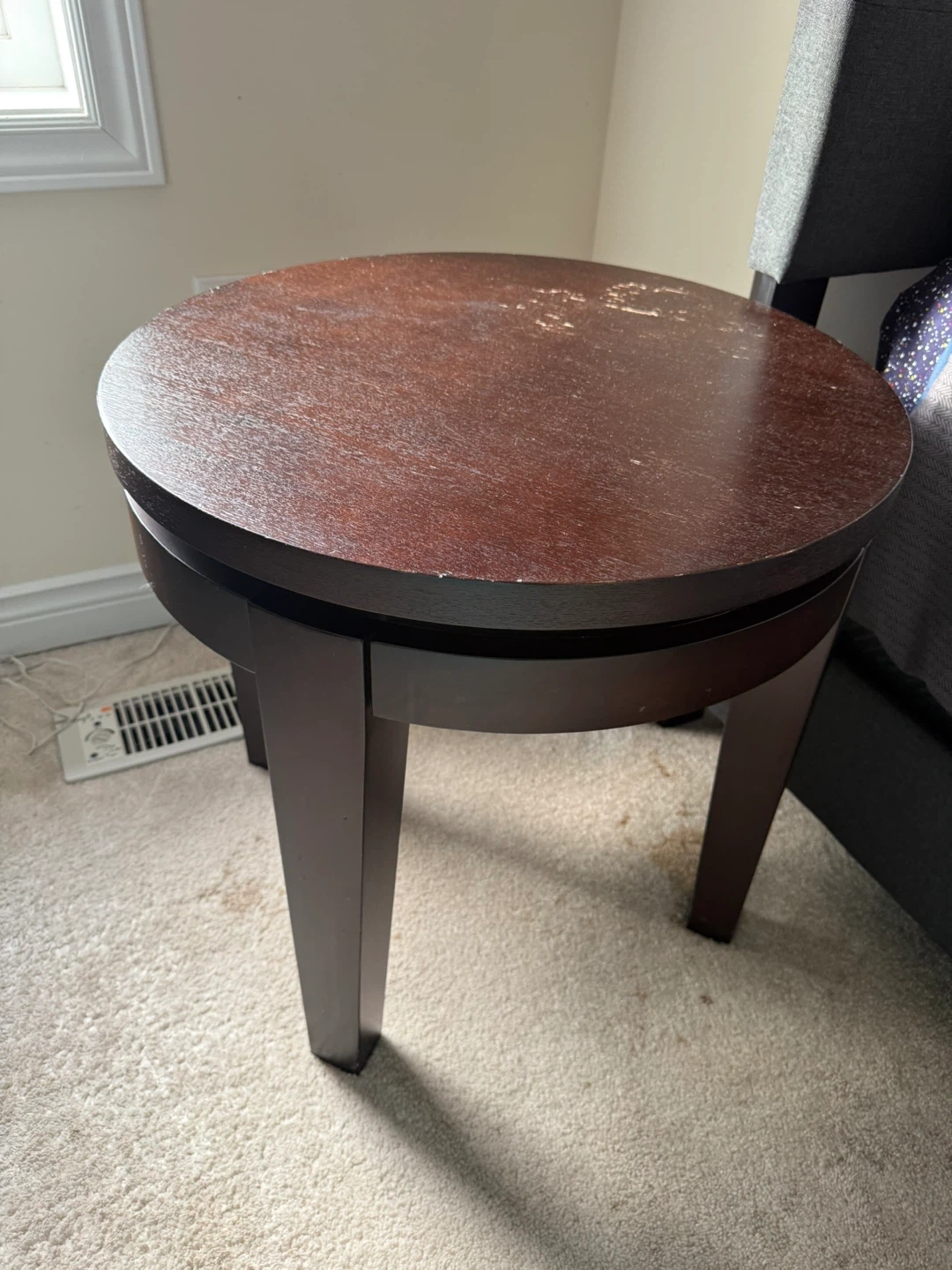 Selling a round wooden side table. It's a nice, sturdy piece, perfect for beside a chair or bed. It does have some wear and tear on the top surface.