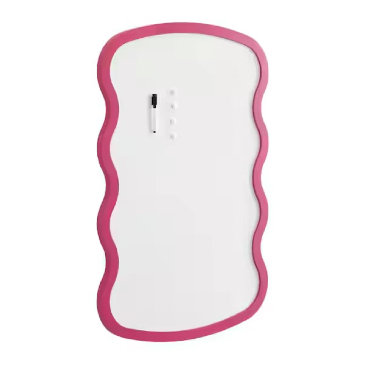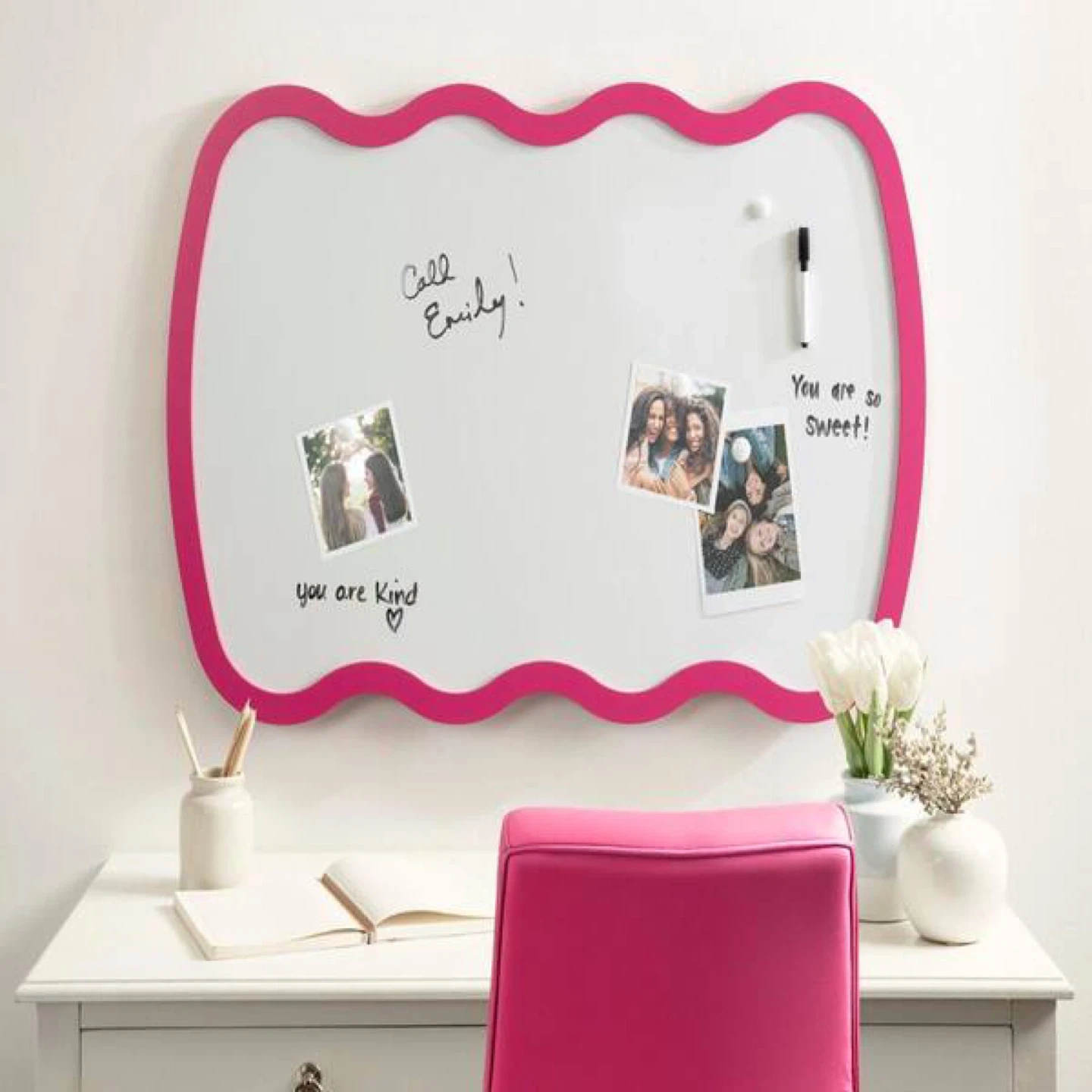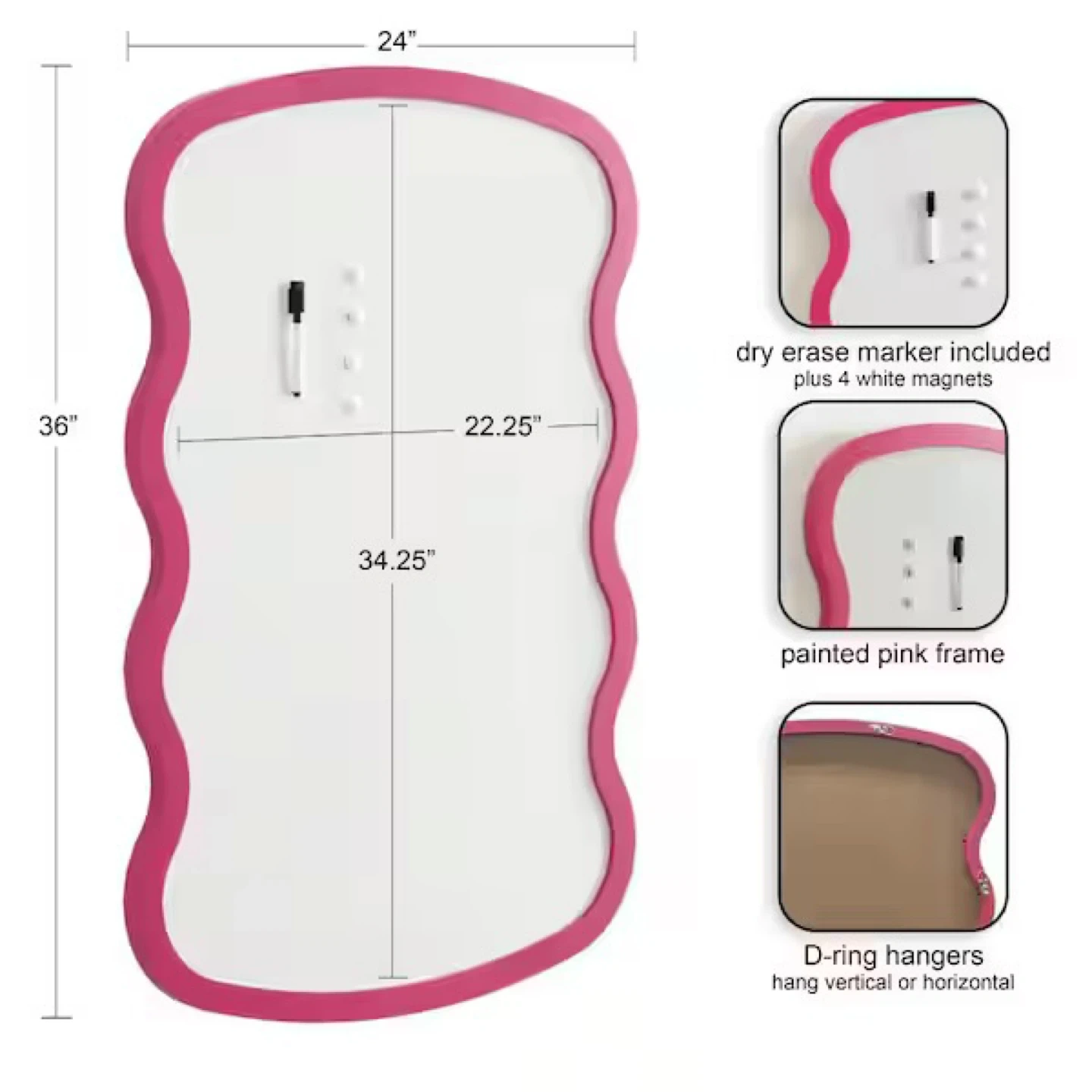 Here's a Pottery Barn Kids whiteboard with a cute wavy pink frame! It measures 36" x 24". It also comes with a dry erase marker and four white magnets. Perfect for a kid's room or home office