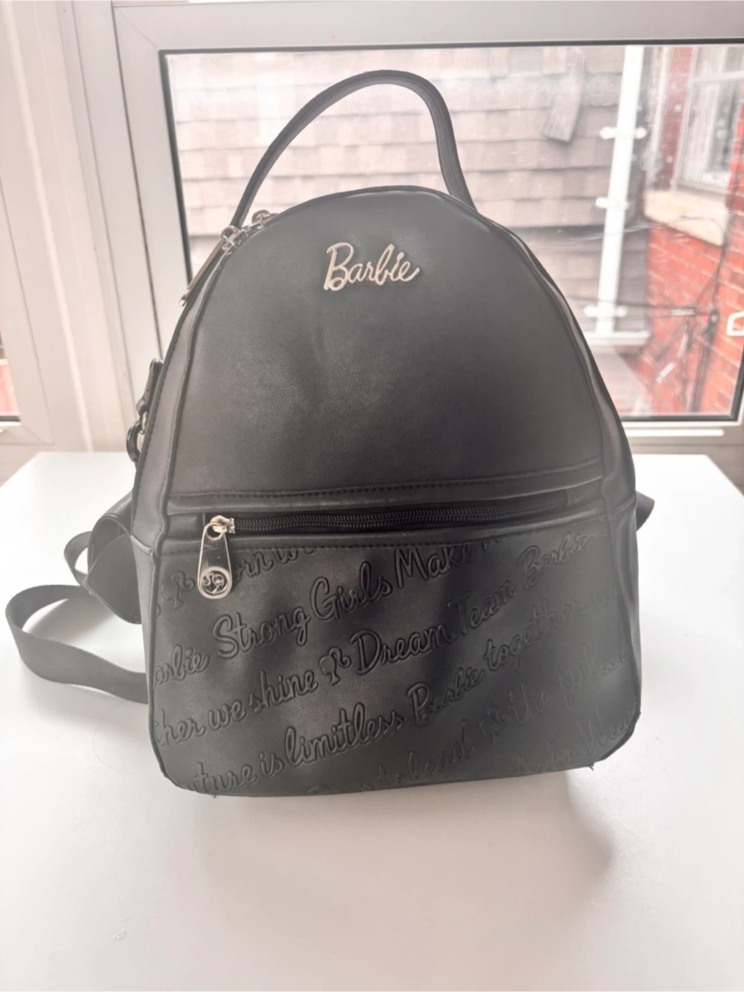 This Barbie mini backpack is in great condition! It's black with a pink interior and features the Barbie logo. The backpack has adjustable straps and a top handle, making it easy to carry around. Perfect for carrying your essentials in style!