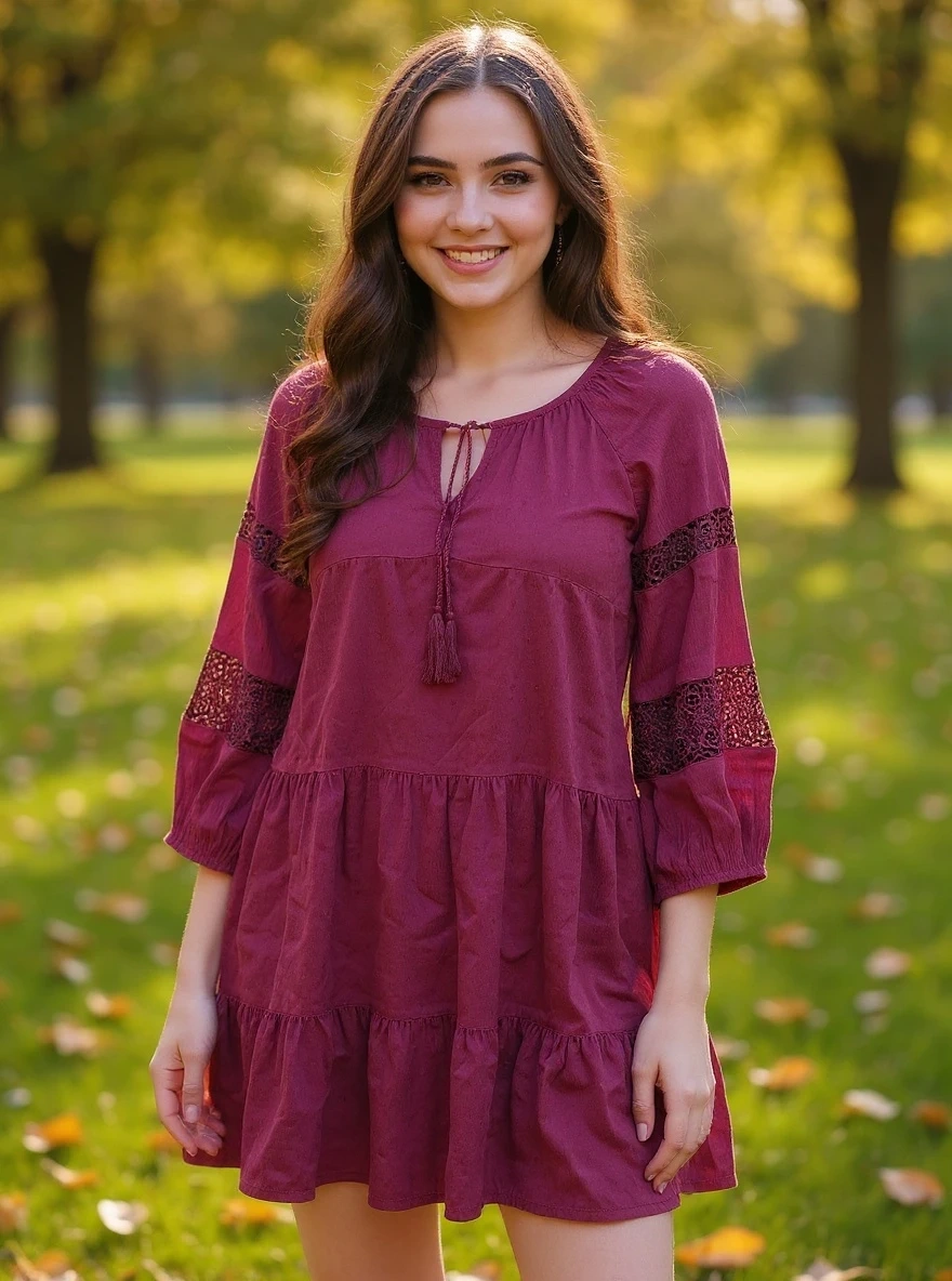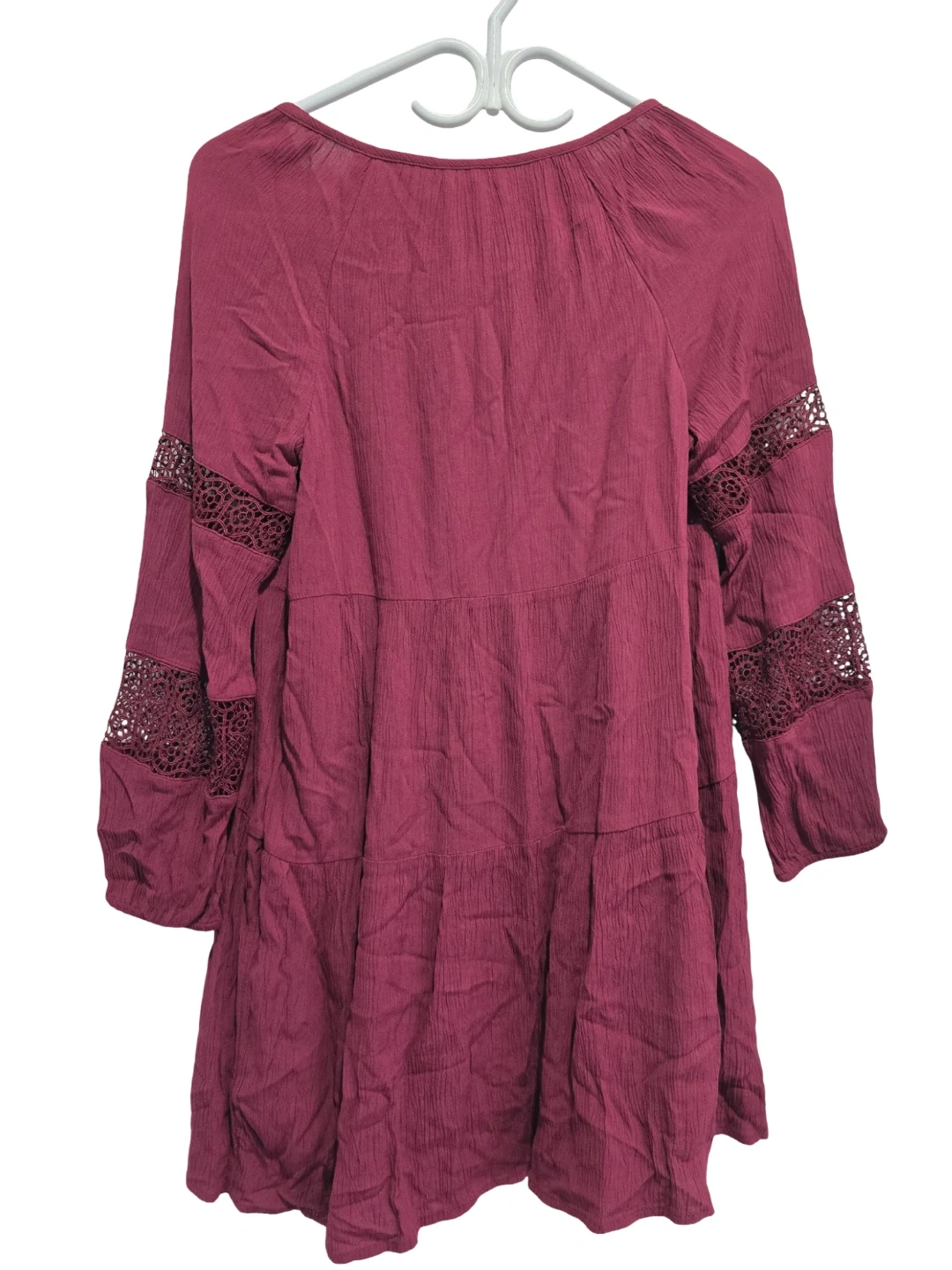 Selling a lovely burgundy dress from Old Navy! It features a tiered design and delicate lace detailing on the sleeves. This dress is perfect for a casual day out or dressed up for a special occasion. Old Navy extra small petite but runs very big and loose