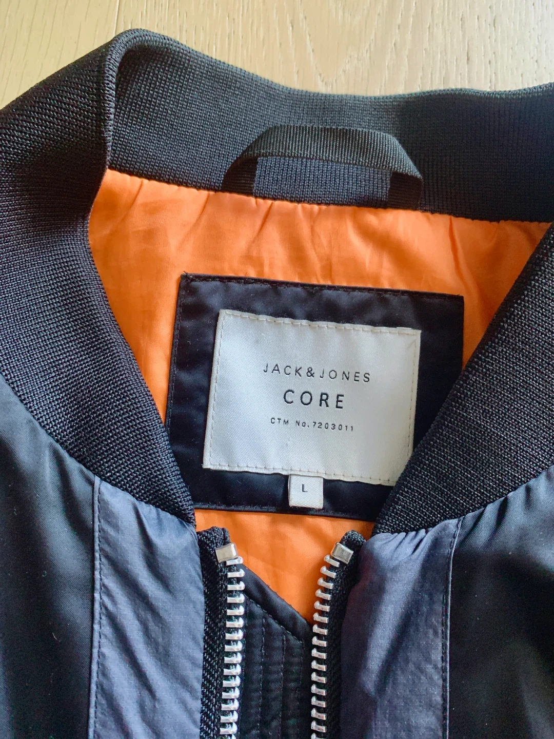 Selling a Jack & Jones Core bomber jacket in black. It's a size L and features cool details like the 'FREQUENCY' and 'FUTURE' patches.