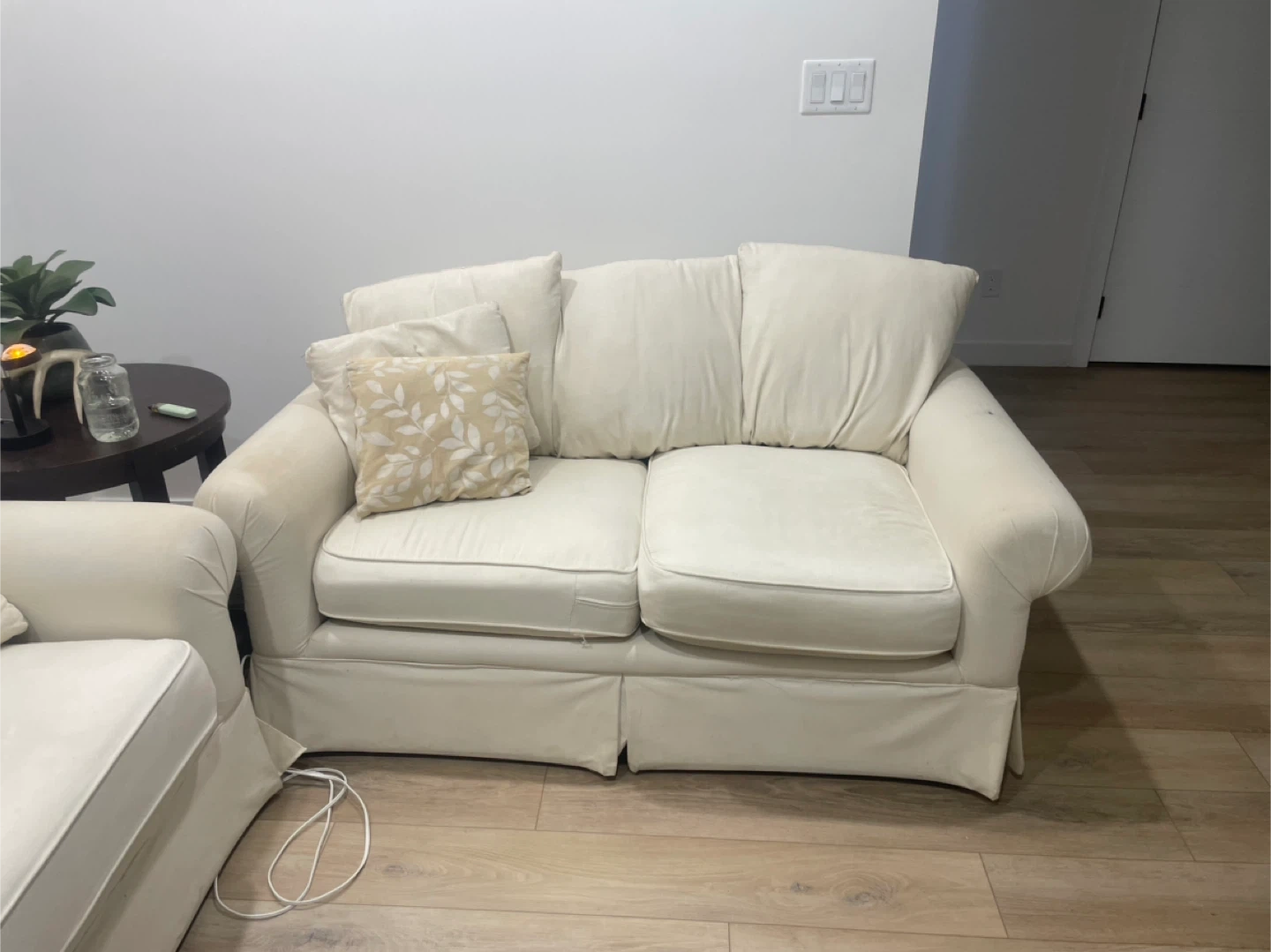 Buy & SellWhite Sofa and Loveseat SetWhite Sofa and Loveseat Set$310Selling a comfy white sofa and loveseat set. Few stains One rip covered by cushions Free delivery is availableWHERE TO MEETCheck LocationView MapSELLERZoeBeaumont170 reviews2 chats·0 favorites·28 views