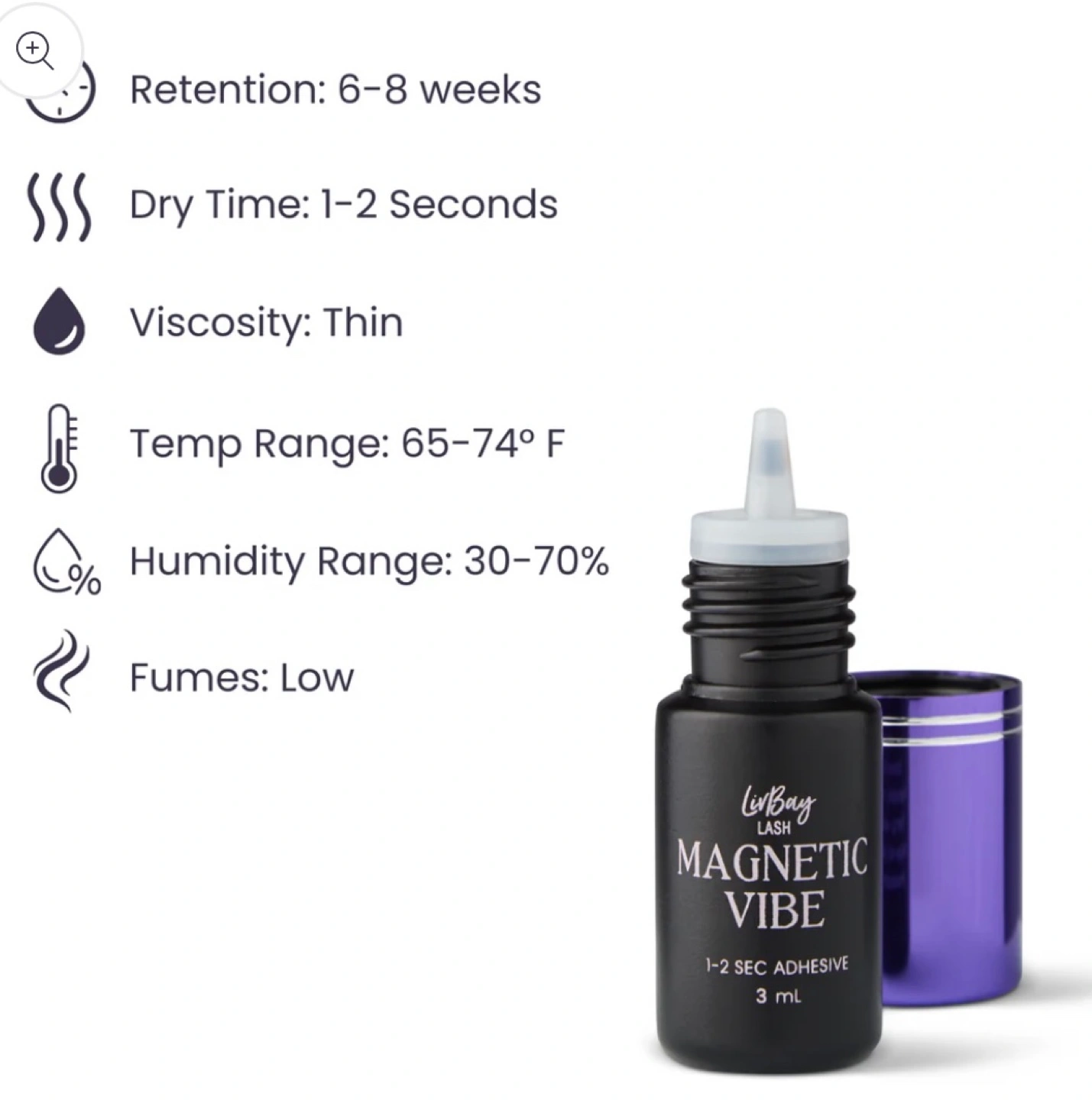 Selling LivBay Lash Magnetic Vibe lash adhesive. It's a 1-2 sec adhesive. The bottle contains 3 mL of product.
