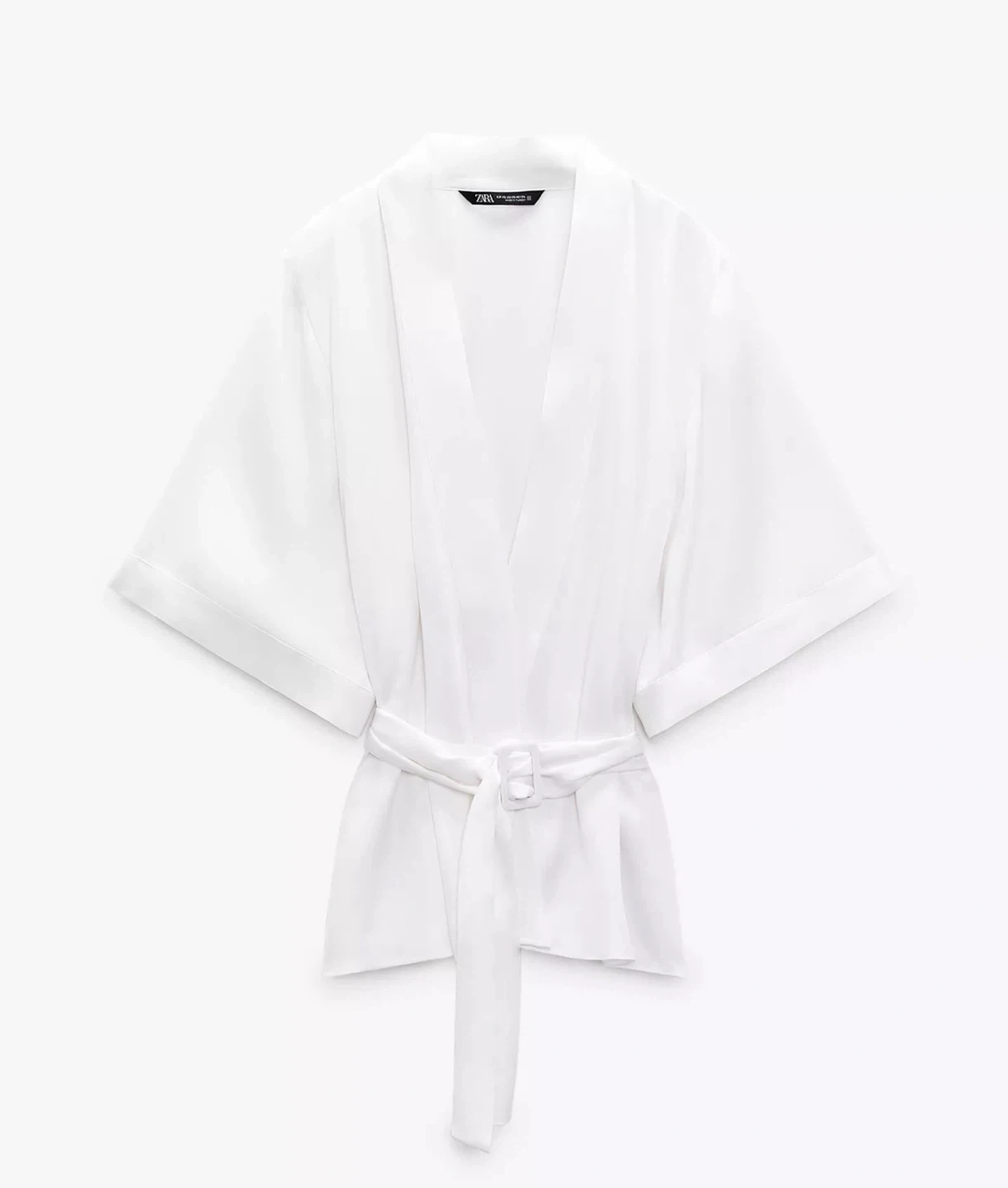 This is a Zara white kimono style top. It features a V-neck and a waist tie. Perfect for a light and breezy look!