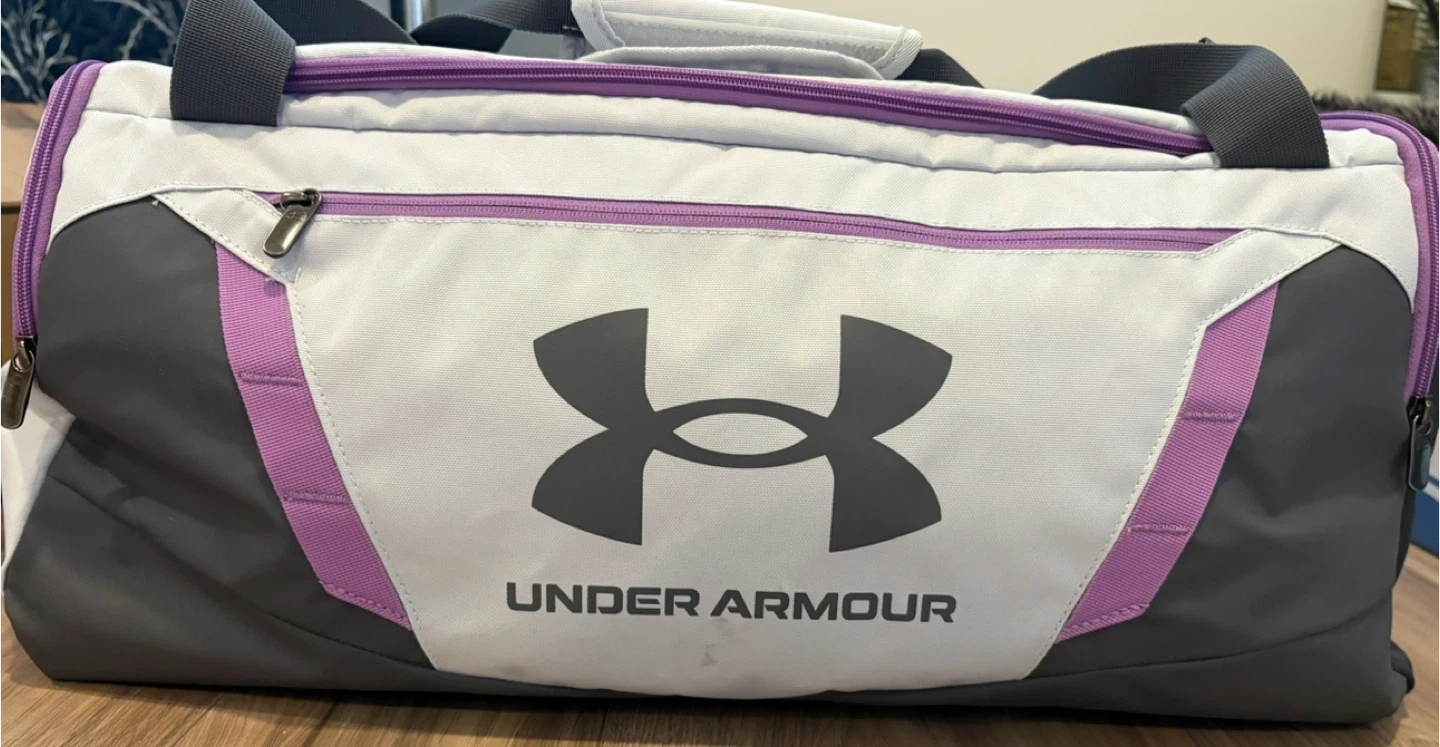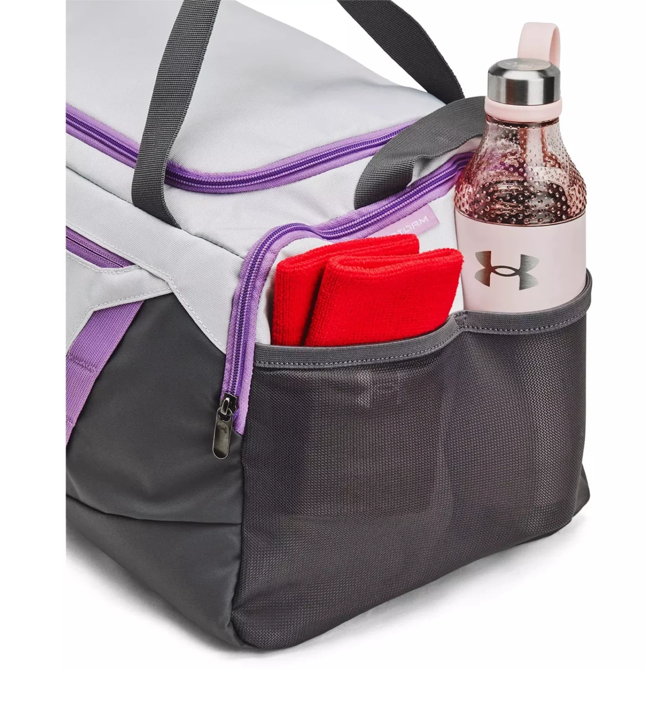 Here's an Under Armour Undeniable 5.0 duffel bag that's perfect for the gym or travel! It's in great shape and ready for a new owner. Has a large Under Armour logo on the front. It's grey, white, and purple.