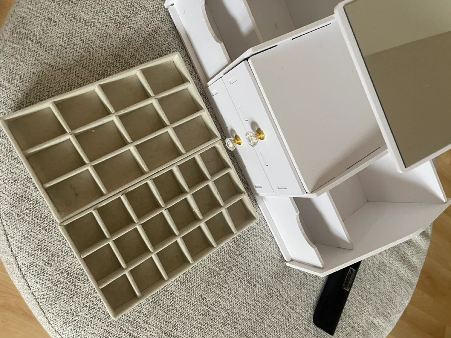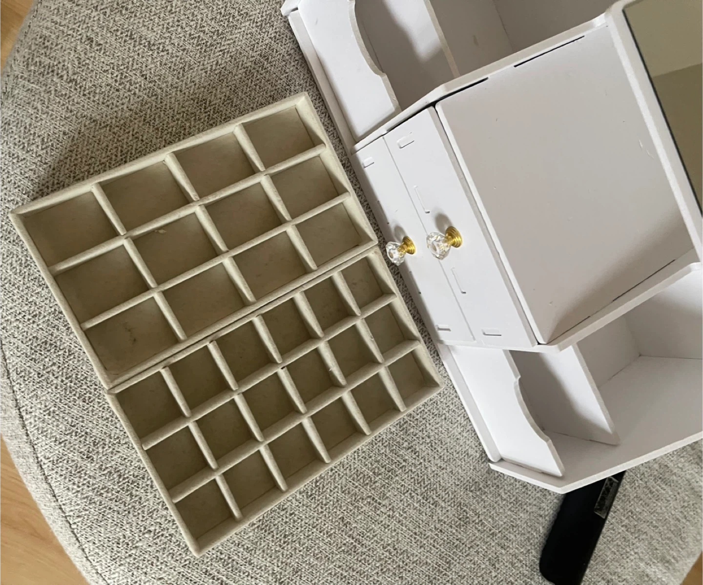 Selling a white wooden makeup organizer, perfect for keeping all your essentials tidy! It features a mirror and several compartments to store your makeup and jewelry. It's in great condition and ready for a new home
