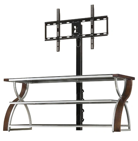 Glass and wood TV stand with three shelves for storage. Sturdy metal frame with curved side design. Fits large TVs and provides space for consoles, speakers, or decor.