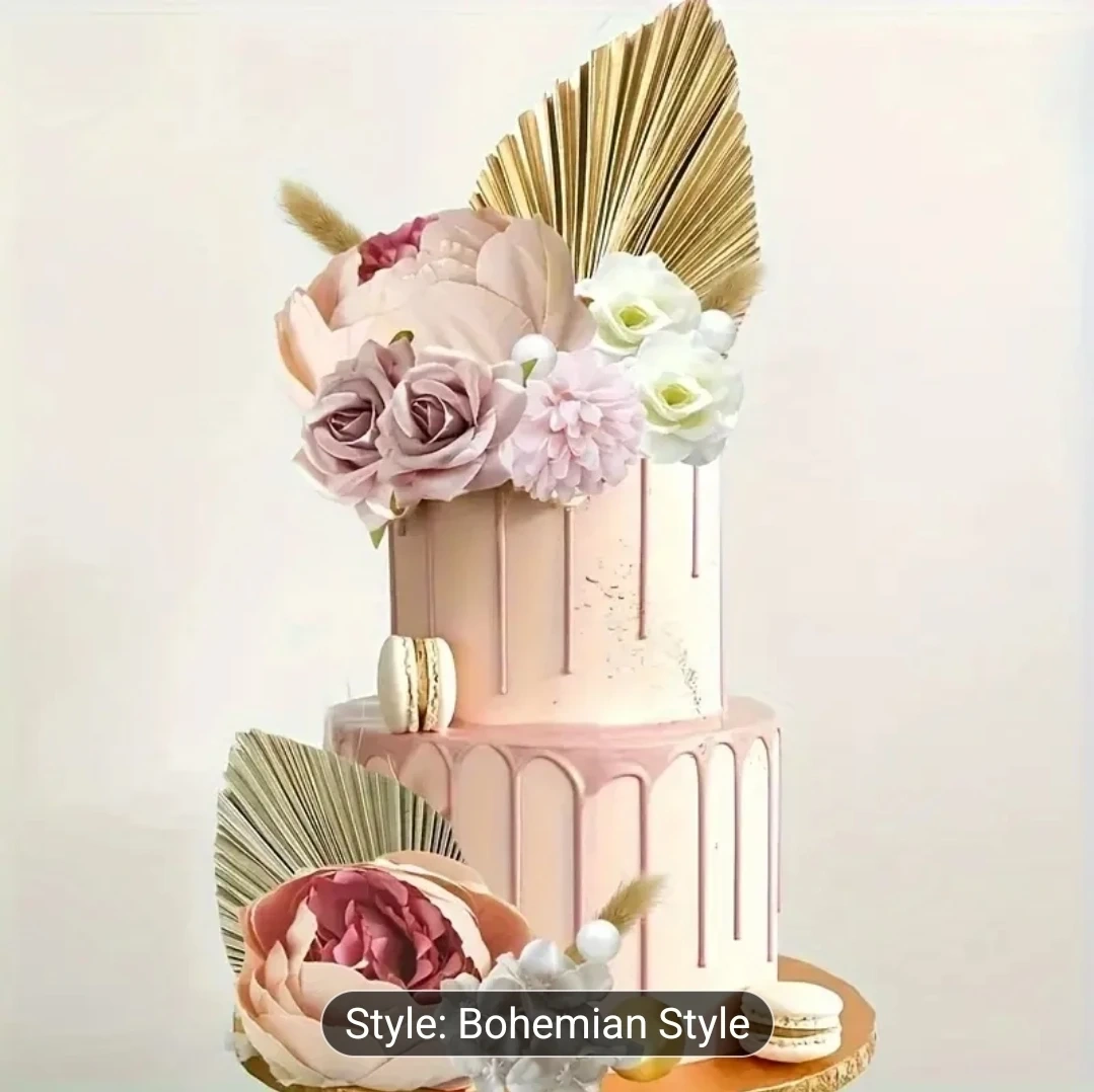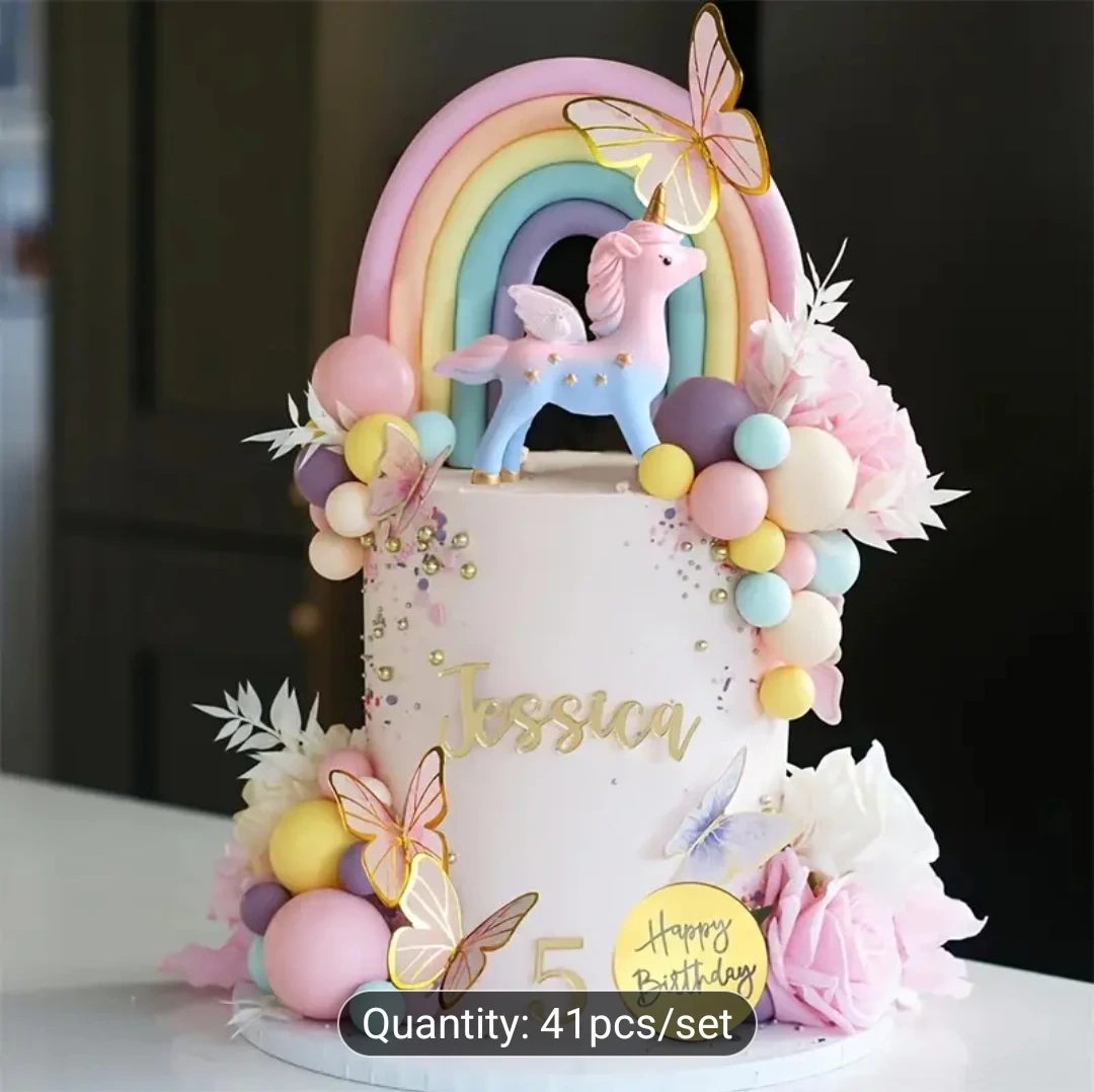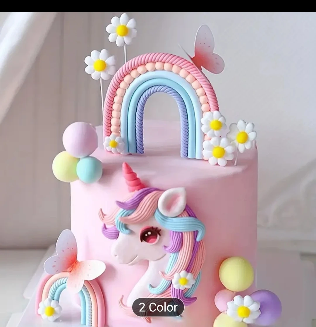 Selling a set of cake decoration toppers! The set includes many different pieces with a variety of designs such as flowers, butterflies, a rainbow, and a unicorn. Perfect for adding a special touch to any cake for birthdays or other celebrations!