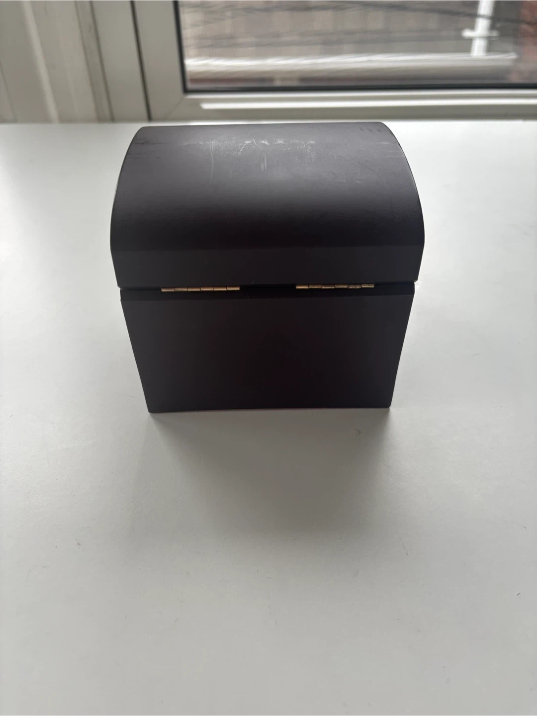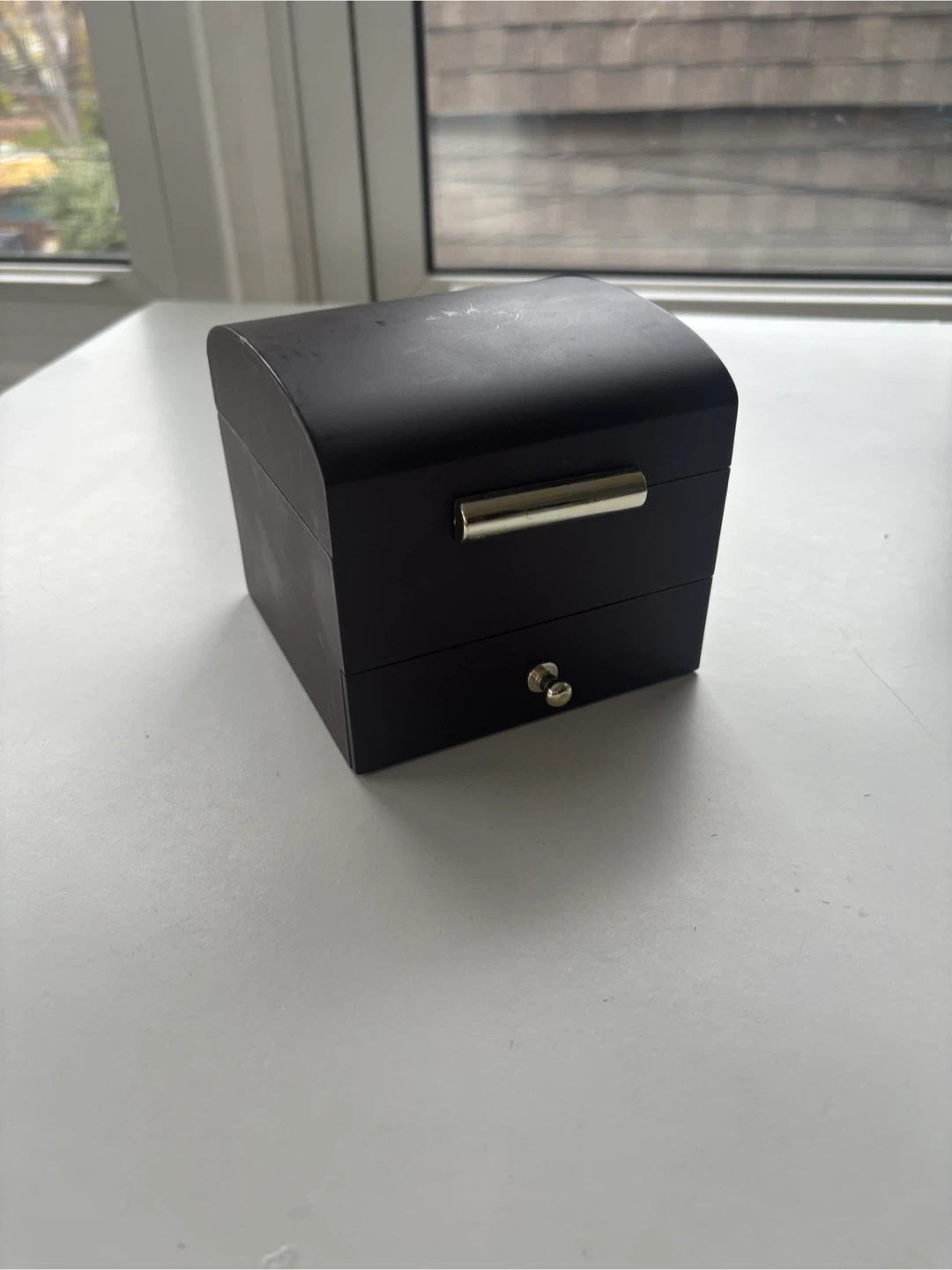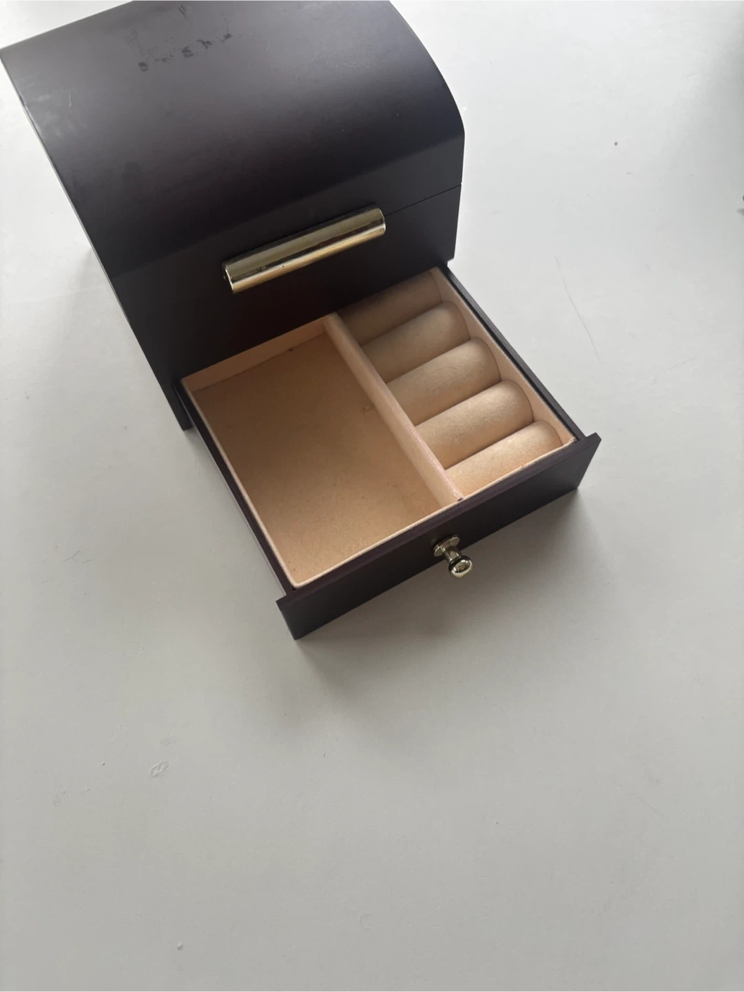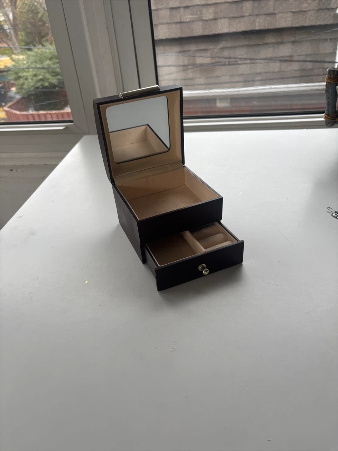 Selling a small dark brown jewelry box! It features a mirror on the inside of the lid and a pull-out drawer for storage. It's in good condition and ready for a new home