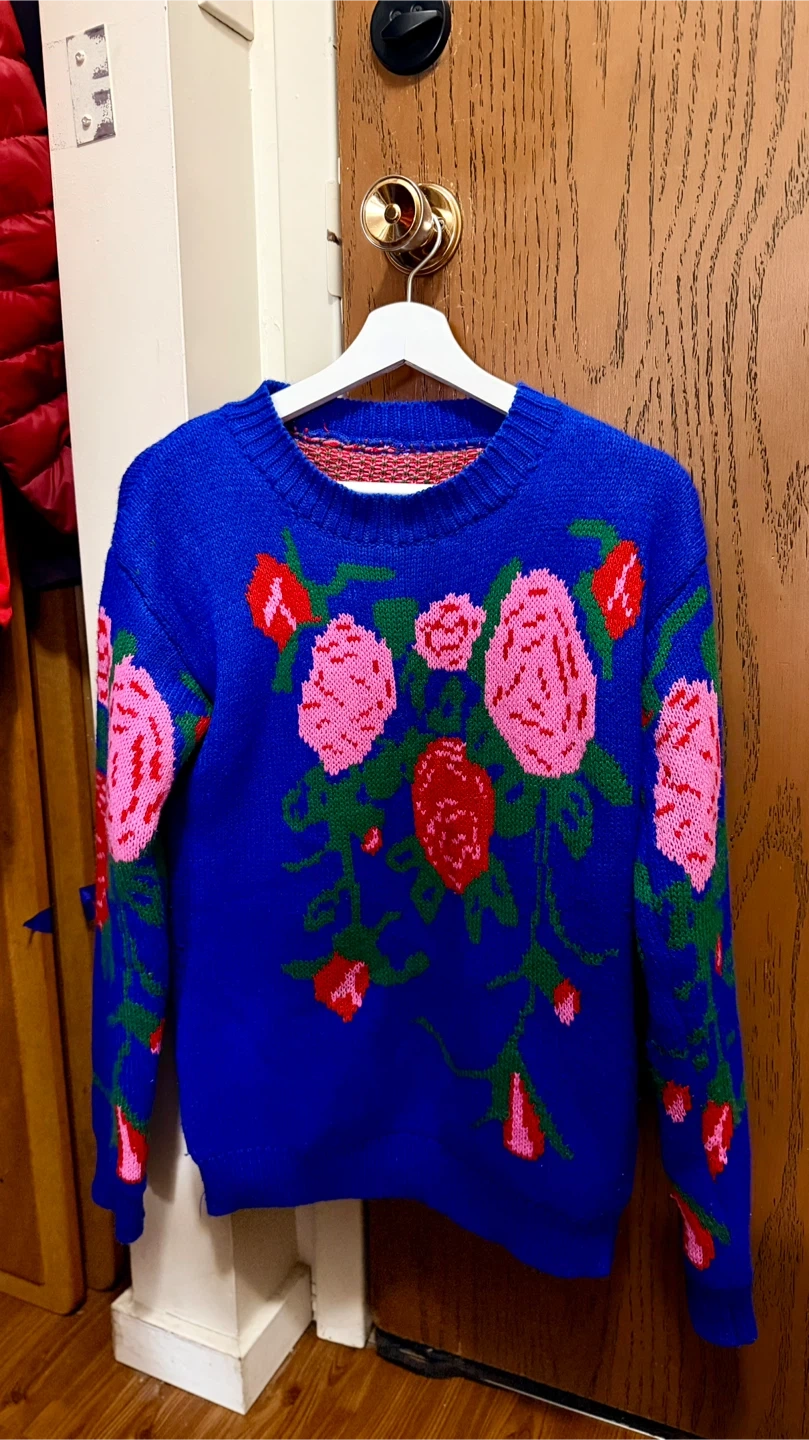 Cozy blue knit sweater with a lovely floral design! Perfect for adding a pop of colour to your wardrobe. Size S/M.