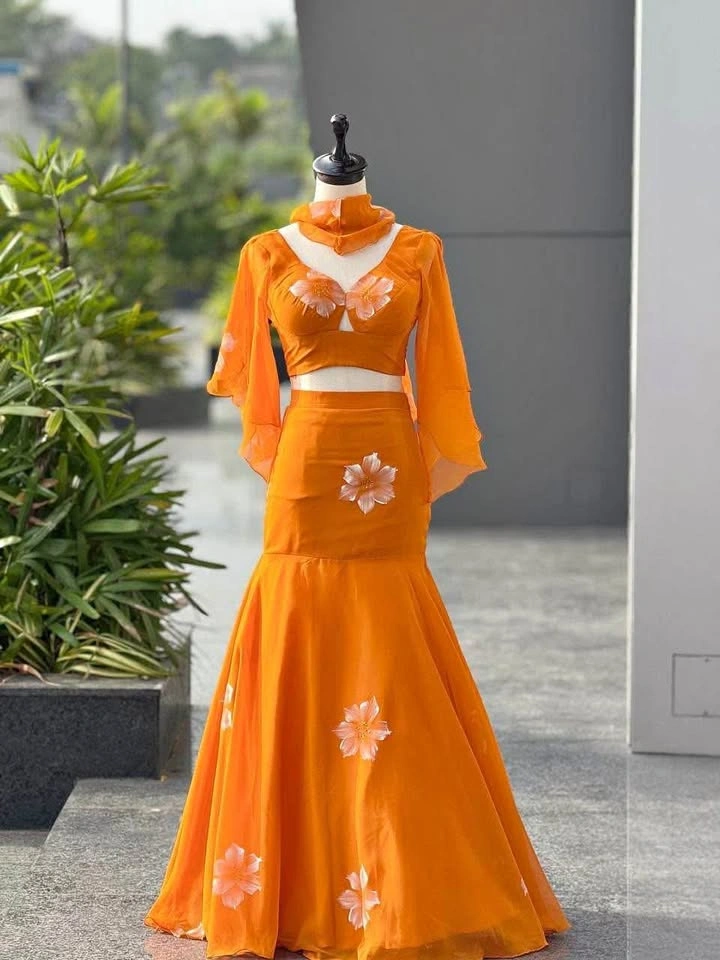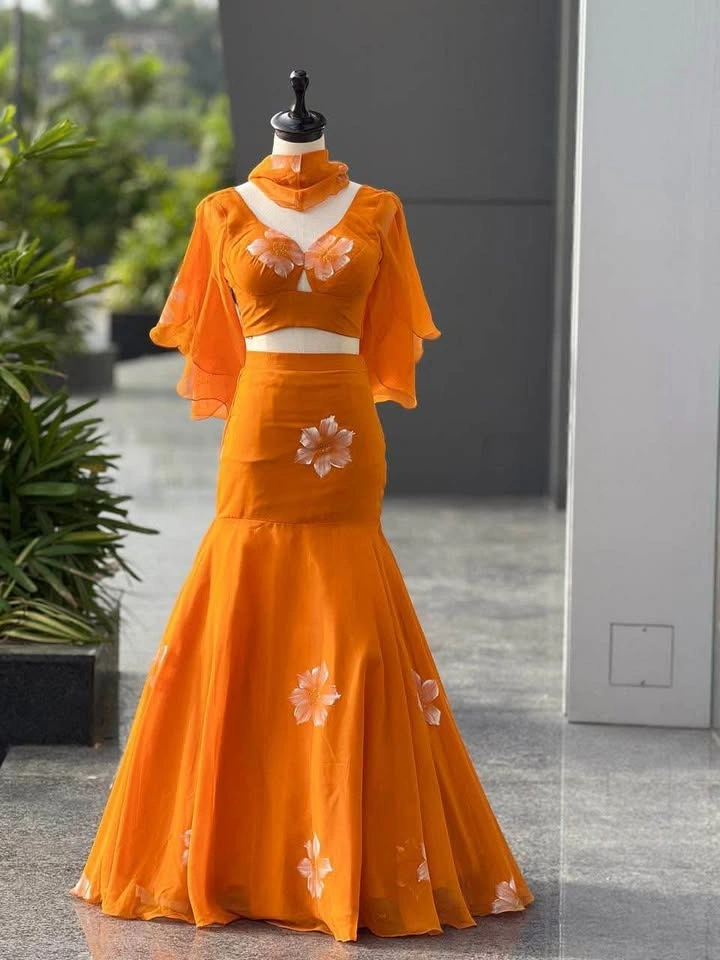 lehnga - Georgette Handpaint work fishcut lehnga with adjustable waist elastic and dori