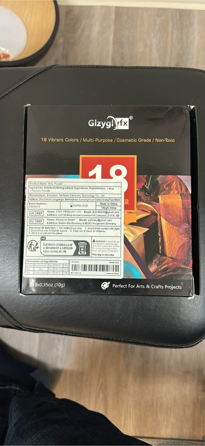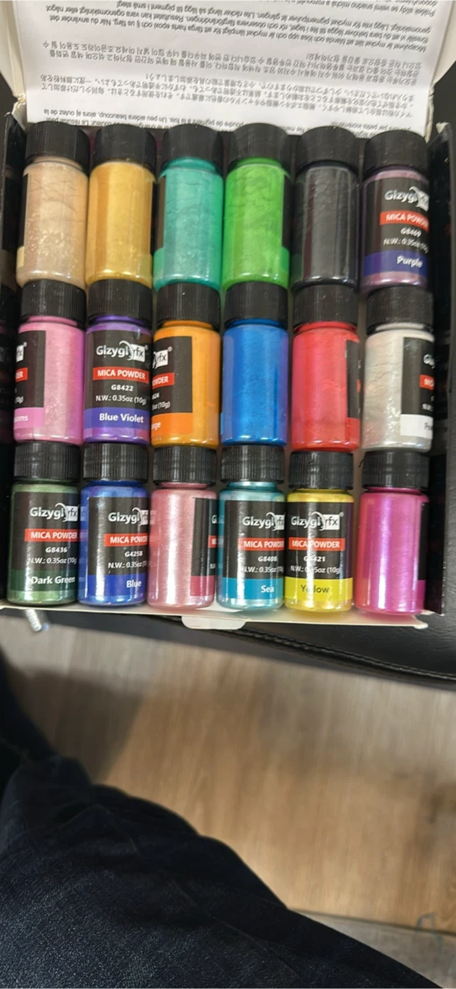 Selling a set of Gizyglfx Mica Powder with 18 vibrant colours! Perfect for arts and crafts projects. The box indicates it's multi-purpose and cosmetic grade, as well as non-toxic. Each container holds 0.35oz (10g).