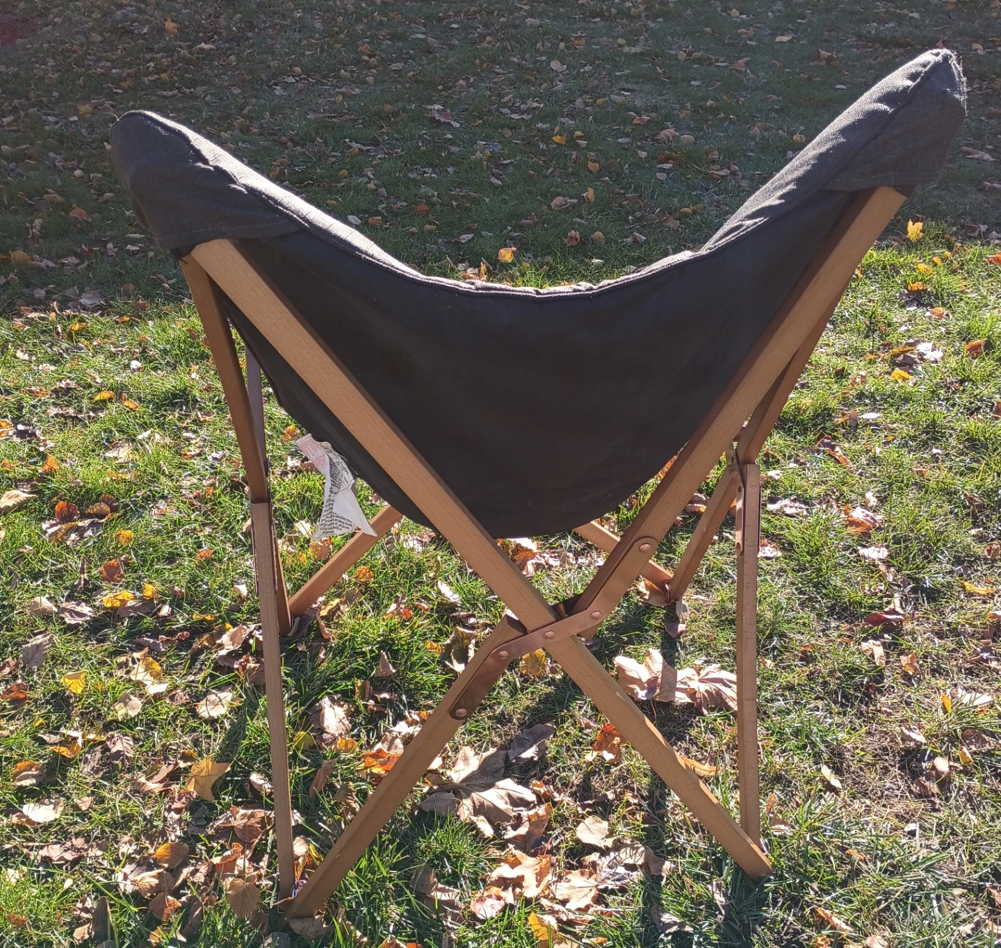 Selling a butterfly chair with a dark gray canvas seat and wooden frame. It's in great condition and is perfect for relaxing outdoors or indoors! The chair folds up easily for storage and transport. It's definitely an elevated take on the butterfly chair with padded body, wood frame & antiqued copper joints.