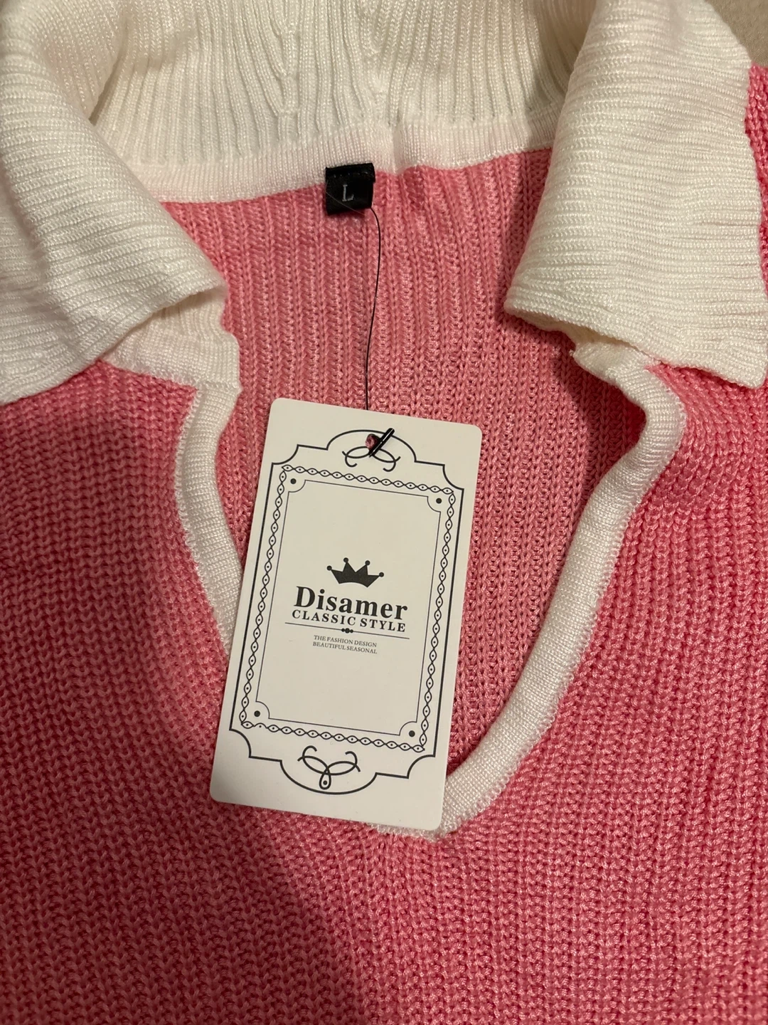 Selling a cute Disamer knit sleeveless top! It's pink and white, perfect for layering or wearing on its own. It's a size L and in great condition