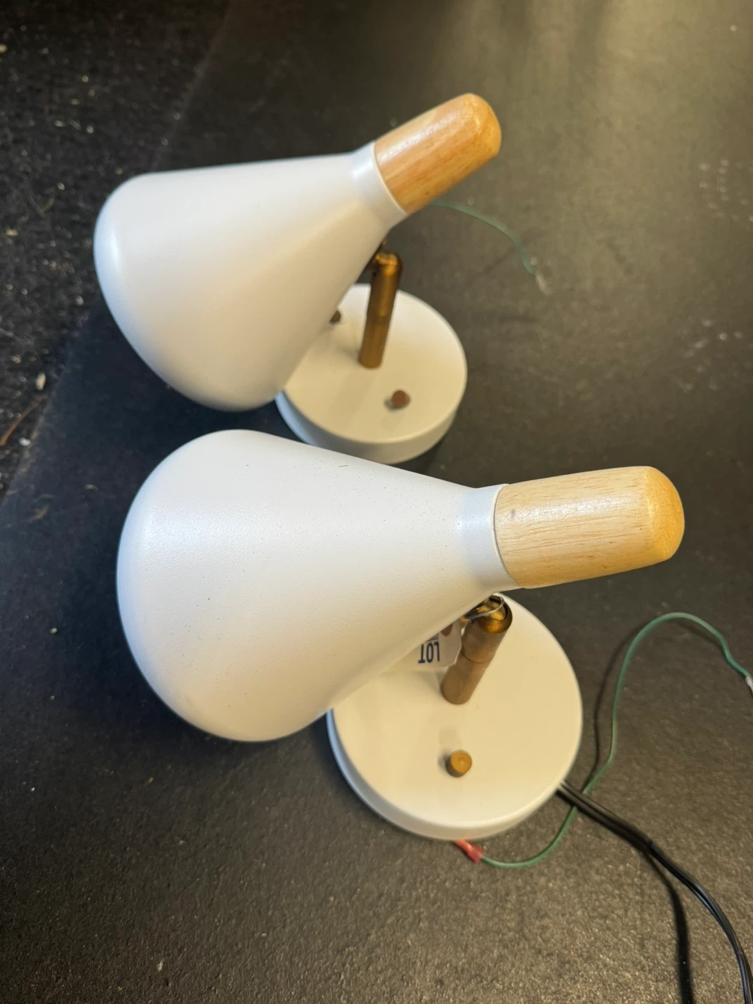 Selling a set of two wall sconces! They feature a white metal shade and a wooden accent piece. They're in great shape and would look great in any room