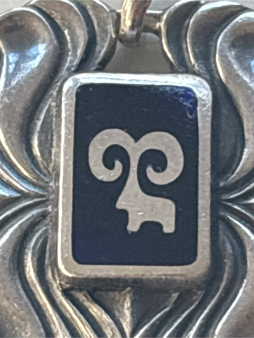 Silver pendant featuring an Aries symbol on a black background. The back of the pendant is stamped with '9TJ' and '925', indicating it's made of sterling silver. It's in great condition and ready to add a unique touch to any outfit