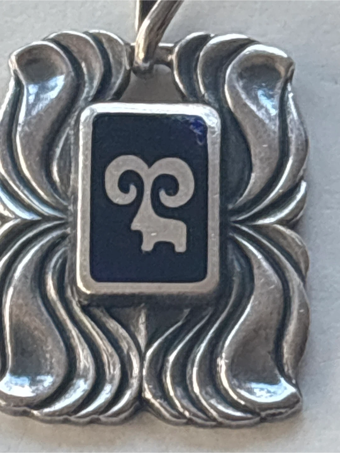 Silver pendant featuring an Aries symbol on a black background. The back of the pendant is stamped with '9TJ' and '925', indicating it's made of sterling silver. It's in great condition and ready to add a unique touch to any outfit