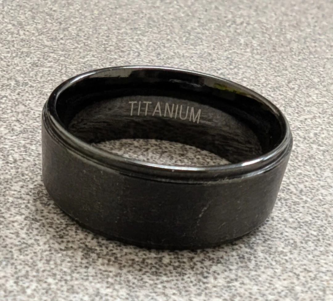356Selling a titanium ring! It's a sleek, dark colour and appears to be in good condition. The word 'TITANIUM' is engraved on the inside