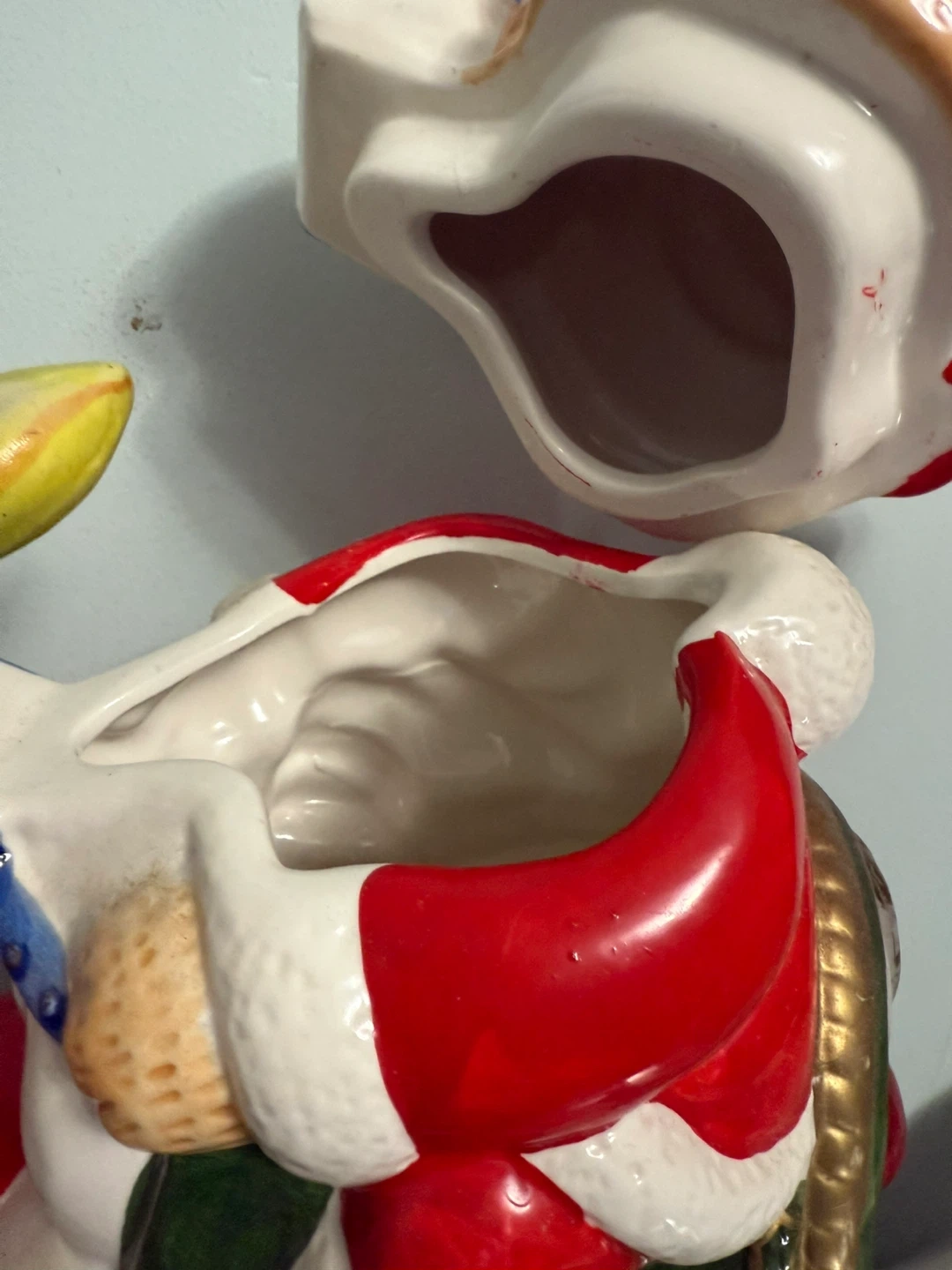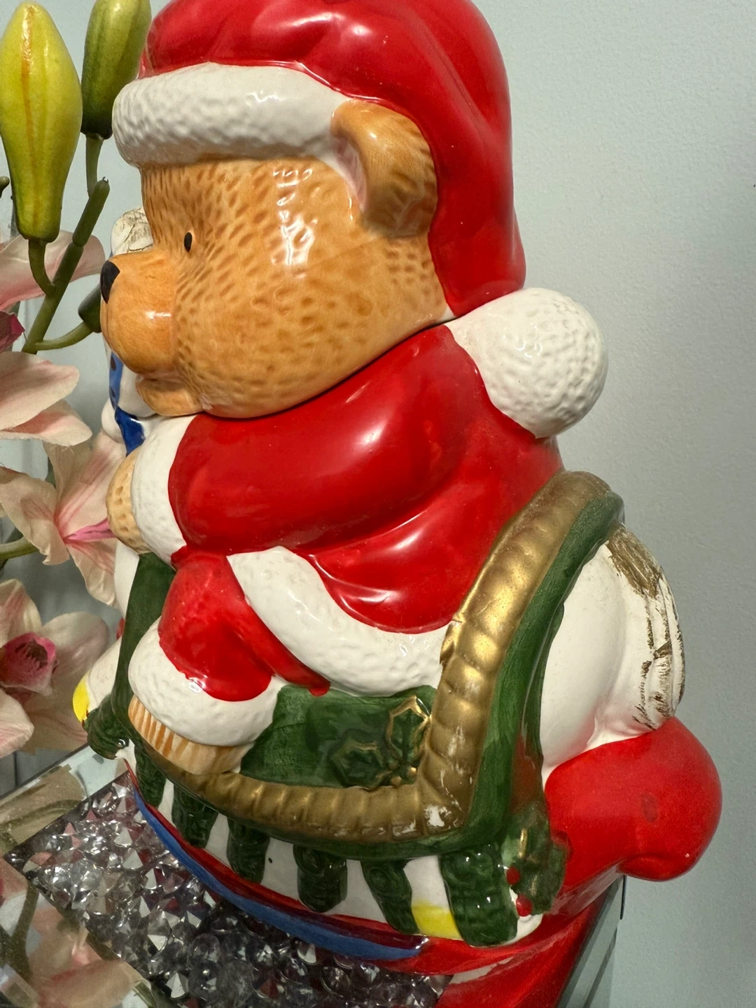 Here's a charming teddy bear cookie jar dressed in a Santa suit, riding a rocking horse! It's perfect for adding a festive touch to your kitchen during the holidays