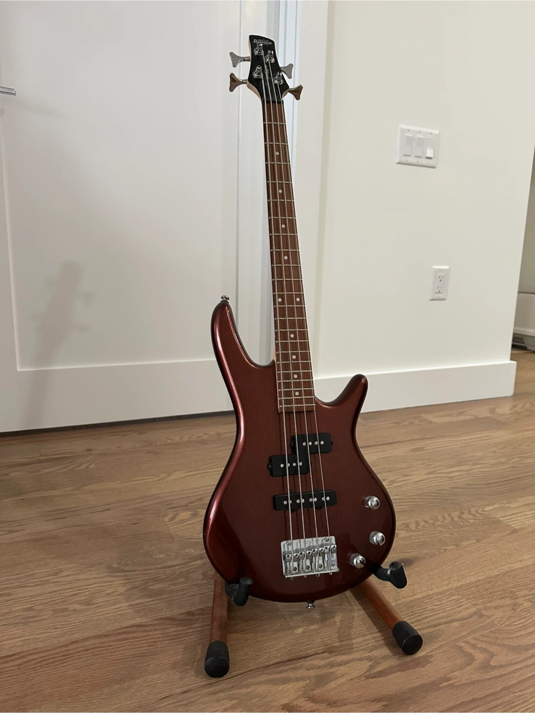 Selling an Ibanez bass guitar in a metallic red finish! Perfect for beginners or experienced players looking for a reliable instrument. The guitar holder is for free!