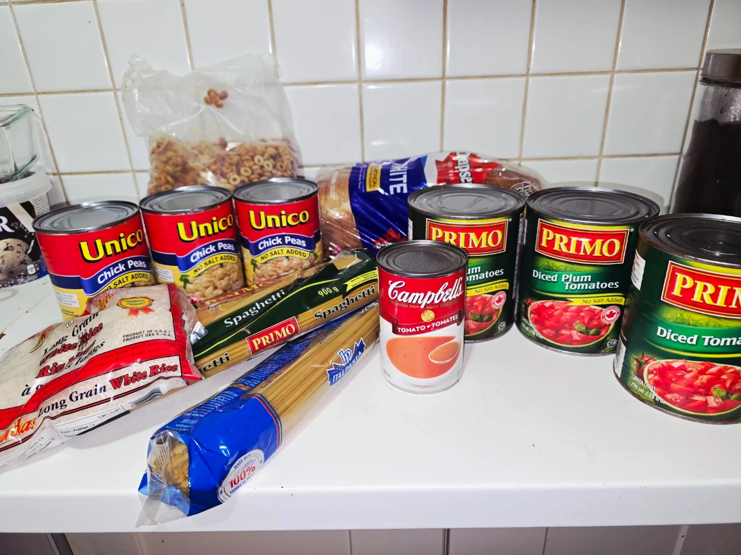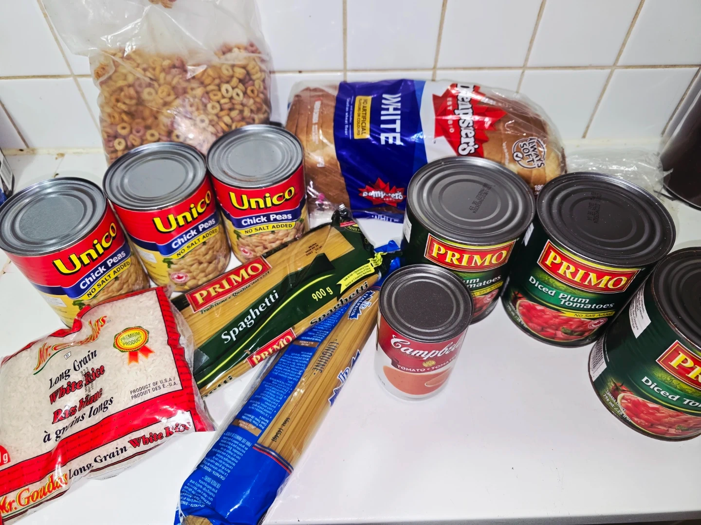 Giving away a variety of pantry staples including Unico chick peas, Primo spaghetti, Mr. Goudas long grain white rice, Strathcona white bread, Campbell's tomato soup, Primo diced plum tomatoes and a bag of cereal. Perfect for stocking up your kitchen!