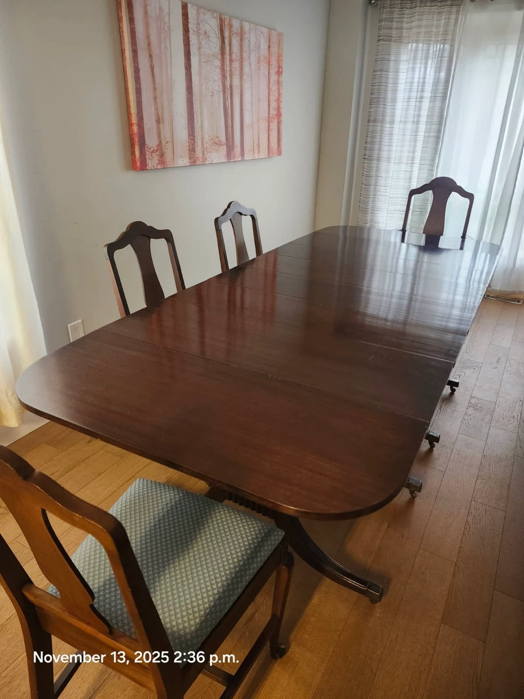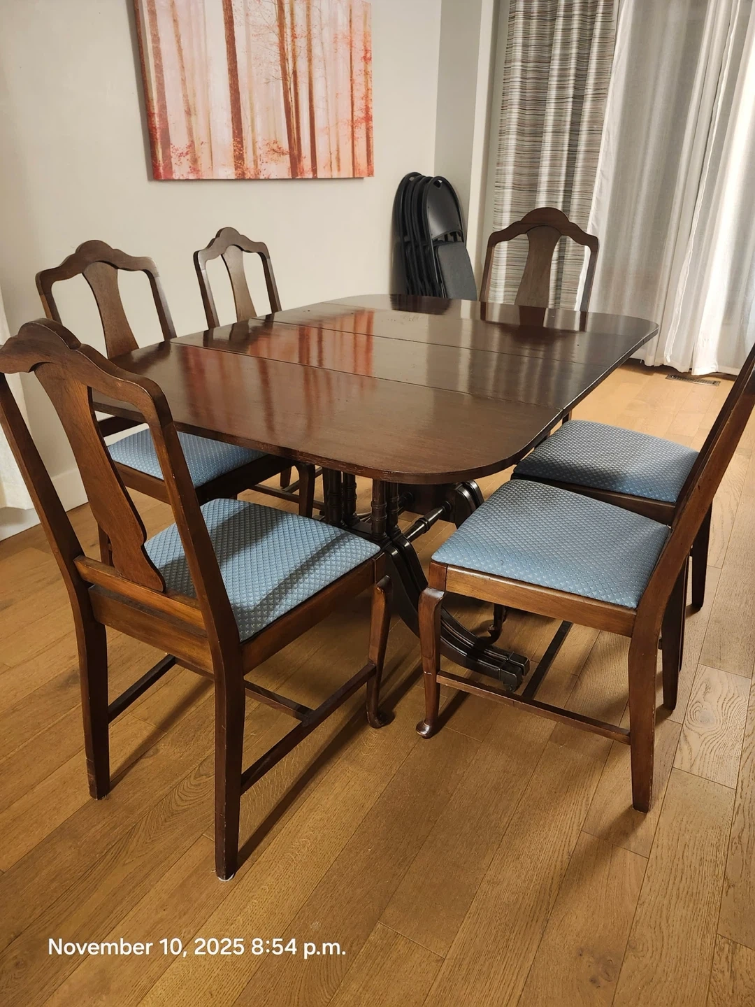 Selling an extendable dining table with six chairs. It's made of wood and has a classic design. It would be a great addition to any dining room!